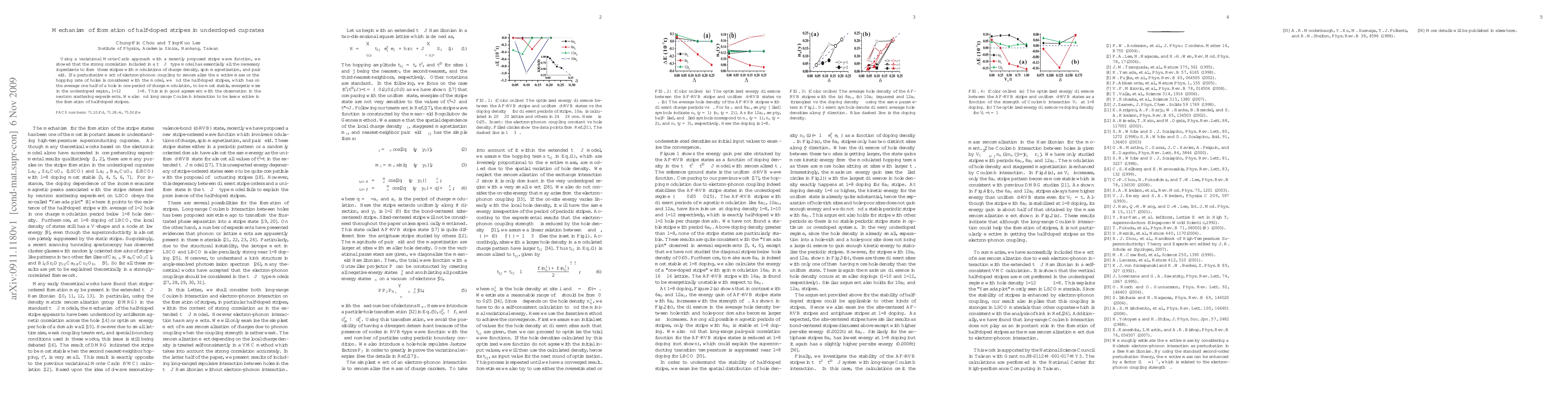 Using a variational Monte-Carlo approach with a recently proposed stripe wave function, we showed that the strong correlation included in a t-J-type model has essentially all the necessary ingredients to form these stripes with modulations of charge density, spin magnetization, and pair field. If a perturbative effect of electron-phonon coupling to renormalize the effective mass or the hopping rate of holes is considered with the model, we find the half-doped stripes, which has on the average one half of a hole in one period of charge modulation, to be most stable, energetic wise in the underdoped region, $1/12\leq\delta\leq1/8$. This is in good agreement with the observation in the neutron scattering experiments. We also find long range Coulomb interaction to be less effective in the formation of half-doped stripes.