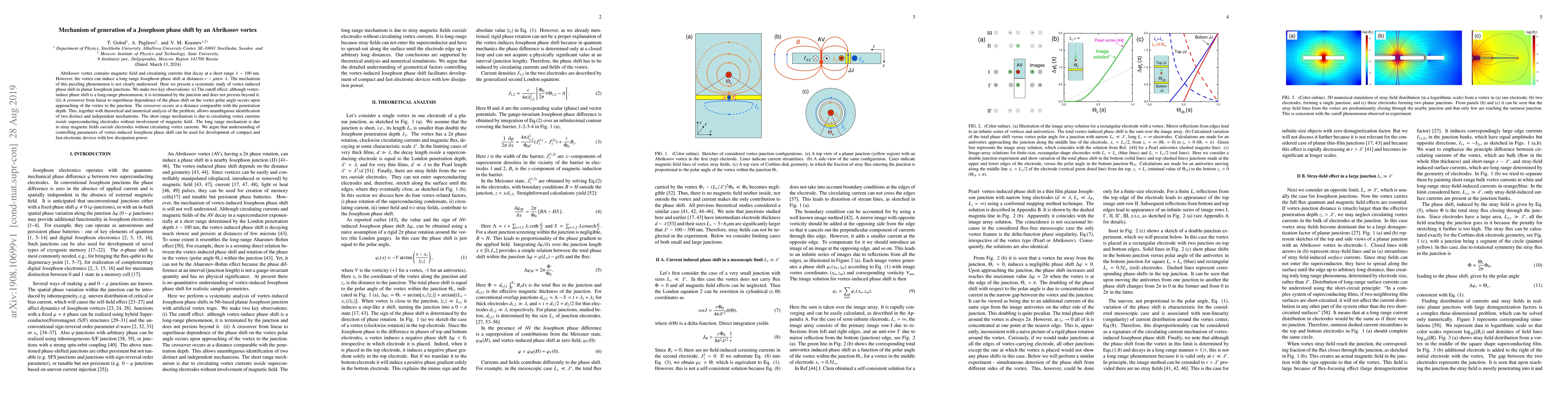 Abrikosov vortex contains magnetic field and circulating currents that decay at a short range $\lambda \sim 100$ nm. However, the vortex can induce a long range Josephson phase shift at distances $r\sim\mu$m$\gg\lambda$. The mechanism of this puzzling phenomenon is not clearly understood. Here we present a systematic study of vortex-induced phase shift in planar Josephson junctions. We make two key observations: (i) The cutoff effect: although vortex-induce phase shift is a long-range phenomenon, it is terminated by the junction and does not persists beyond it. (ii) A crossover from linear to superlinear dependence of the phase shift on the vortex polar angle occurs upon approaching of the vortex to the junction. The crossover occurs at a distance comparable with the penetration depth. This, together with theoretical and numerical analysis of the problem, allows unambiguous identification of two distinct and independent mechanisms. The short range mechanism is due to circulating vortex currents {\it inside} superconducting electrodes without involvement of magnetic field. The long range mechanism is due to stray magnetic fields {\it outside} electrodes without circulating vortex currents. We argue that understanding of controlling parameters of vortex-induced Josephson phase shift can be used for development of compact and fast electronic devices with low dissipation power.