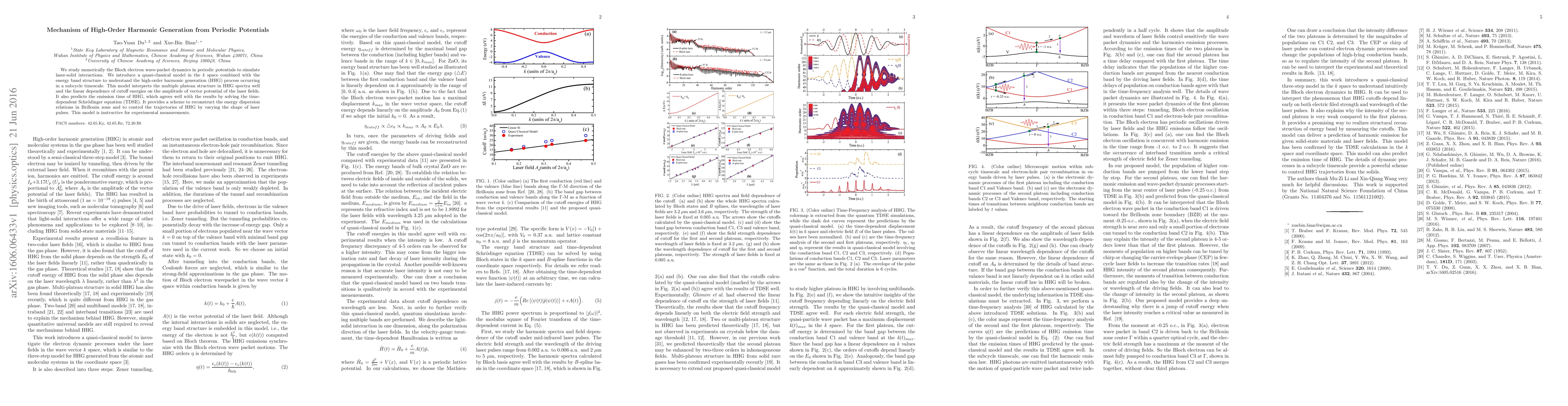 We study numerically the Bloch electron wave-packet dynamics in periodic potentials to simulate laser-solid interactions. We introduce a quasi-classical model in the \emph{k} space combined with the energy band structure to understand the high-order harmonic generation (HHG) process occurring in a subcycle timescale. This model interprets the multiple plateau structure in HHG spectra well and the linear dependence of cutoff energies on the amplitude of vector potential of the laser fields. It also predicts the emission time of HHG, which agrees well with the results by solving the time-dependent Schr\"{o}dinger equation (TDSE). It provides a scheme to reconstruct the energy dispersion relations in Brillouin zone and to control the trajectories of HHG by varying the shape of laser pulses. This model is instructive for experimental measurements.