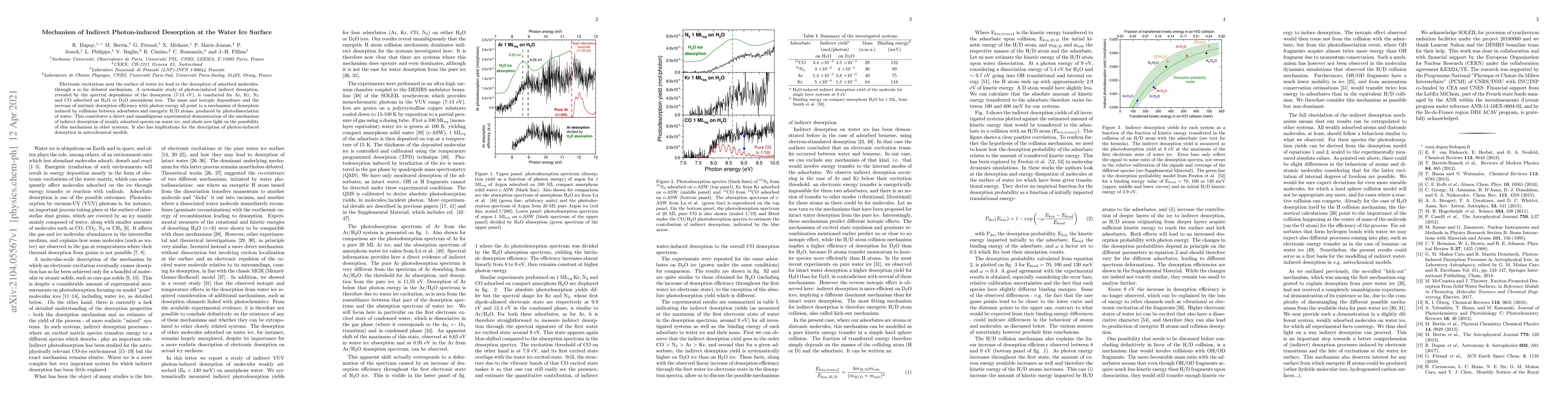 This study elucidates the mechanism of indirect photon-induced desorption of adsorbed molecules on water ice, revealing that desorption is driven by collisions between adsorbates and energetic H or D atoms from photodissociated water. The findings provide a clear demonstration of this mechanism and have implications for astrochemical models.
