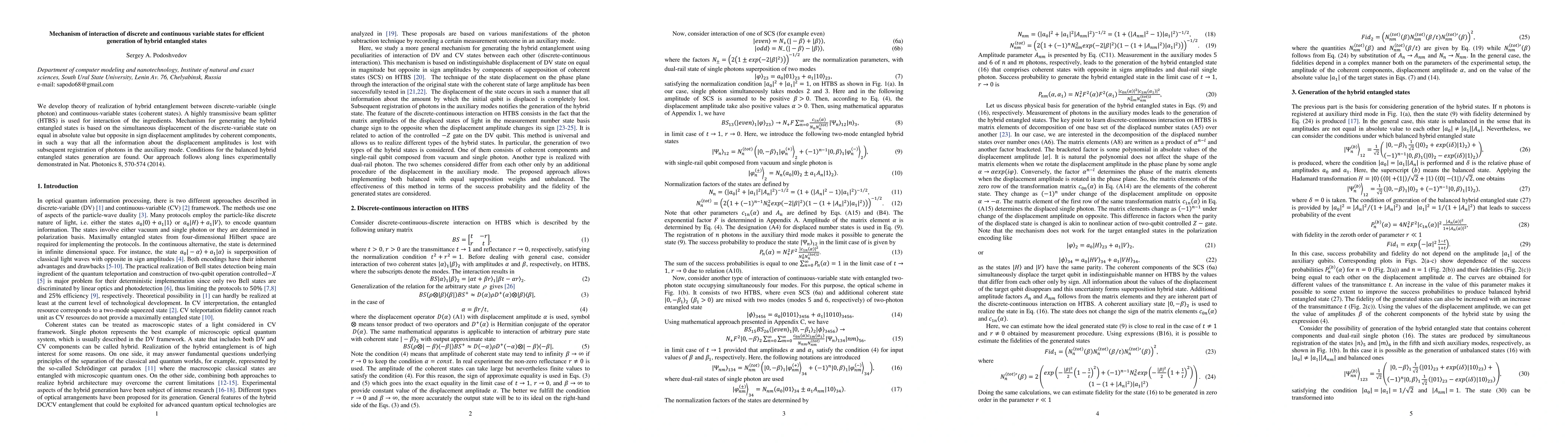 This paper proposes a theoretical framework for generating hybrid entangled states combining discrete-variable (single photon) and continuous-variable (coherent states) through a highly transmissive beam splitter. The method involves displacing the discrete-variable state with coherent components, leading to loss of information about displacement amplitudes and subsequent photon registration in an auxiliary mode.