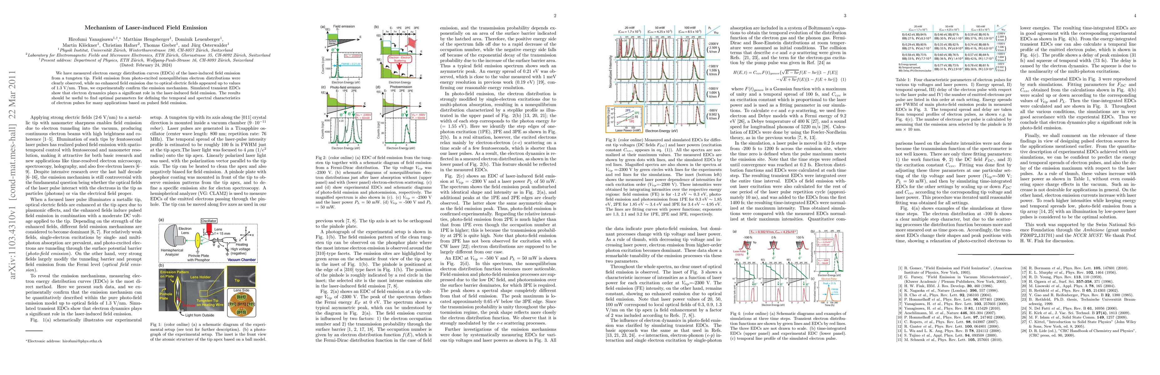 This paper experimentally measures electron energy distribution curves from laser-induced field emission from a tungsten tip, confirming the emission mechanism through photo-excited nonequilibrium electron distributions without optical field enhancement. Simulated dynamics highlight the importance of electron behavior in this process, providing insights for optimizing electron pulse parameters in pulsed field emission applications.