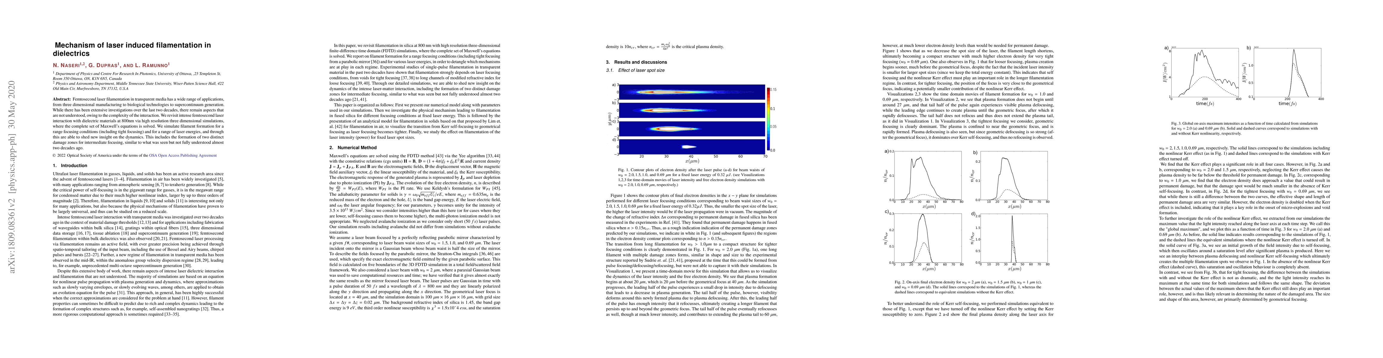This paper investigates the mechanism of laser filamentation in dielectrics, particularly in fused silica, using high-resolution FDTD simulations. It reveals that Kerr nonlinearity dominates in loose focusing conditions, while geometrical focusing becomes significant in tight focusing, aligning with experimental observations.