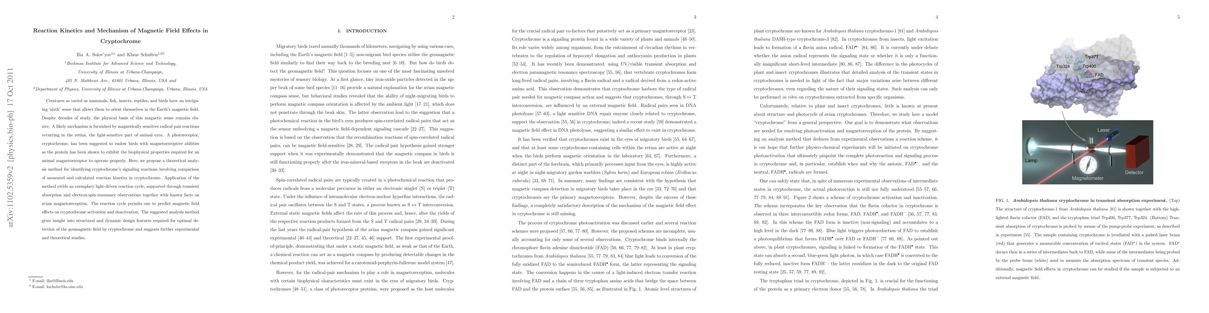 This paper proposes a detailed mechanism by which cryptochrome, a photoreceptor, enables birds to sense the Earth's magnetic field through radical pair reactions in the retina. It establishes the feasibility of cryptochrome as a geomagnetic compass and suggests future studies to explore its structural and dynamic features.