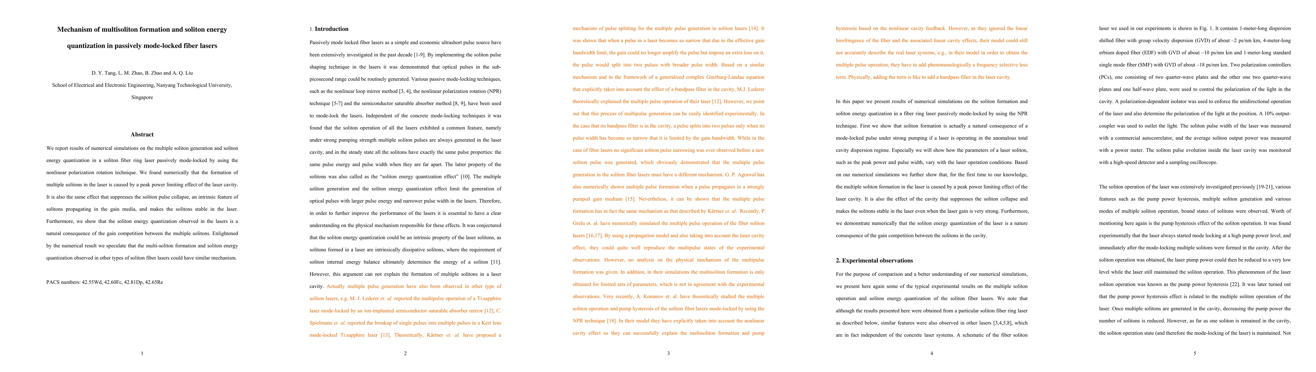 This paper reports numerical simulations revealing the mechanism of multisoliton formation and soliton energy quantization in passively mode-locked fiber ring lasers. The simulations show that peak power limiting in the laser cavity stabilizes solitons and suppresses pulse collapse, while gain competition between solitons leads to soliton energy quantization.