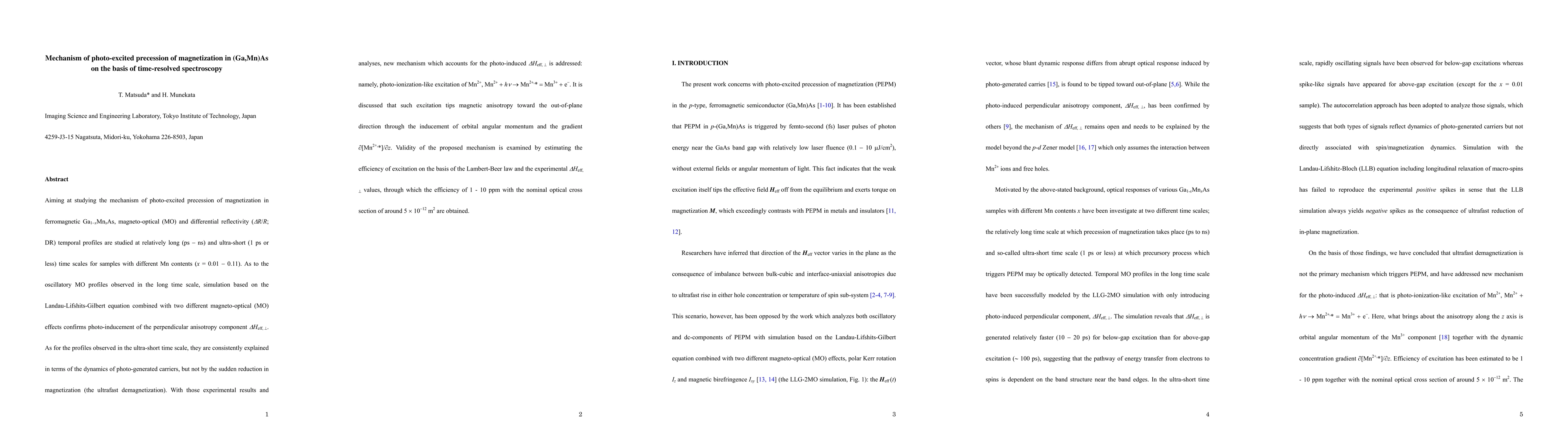 Aiming at studying the mechanism of photo-excited precession of magnetization in ferromagnetic (Ga,Mn)As, magneto-optical (MO) and differential reflectivity (DR) temporal profiles are studied at relatively long and ultra-short time scales for samples with different Mn contents (x=0.01-0.11). As to the oscillatory MO profiles observed in the long time scale, simulation based on the LLG equation combined with two different MO effects confirms photo-inducement of the perpendicular anisotropy component p-Heff. As for the profiles observed in the ultra-short time scale, they are consistently explained in terms of the dynamics of photo-generated carriers, but not by the sudden reduction in magnetization. With those experimental results and analyses, new mechanism which accounts for the photo-induced p-Heff is addressed; photo-ionization like excitation of Mn(II). Namely, Mn(II) is excited into Mn(III) and e . It is discussed that such excitation tips magnetic anisotropy toward the out-of-plane direction through the inducement of orbital angular momentum and the gradient dMn(II*)/dz. Validity of the proposed mechanism is examined by estimating the efficiency of excitation on the basis of the Lambert-Beer law and the experimental p-Heff values, through which the efficiency of 1-10 ppm with the nominal optical cross section of around 5 x 10^12 m^2 are obtained.