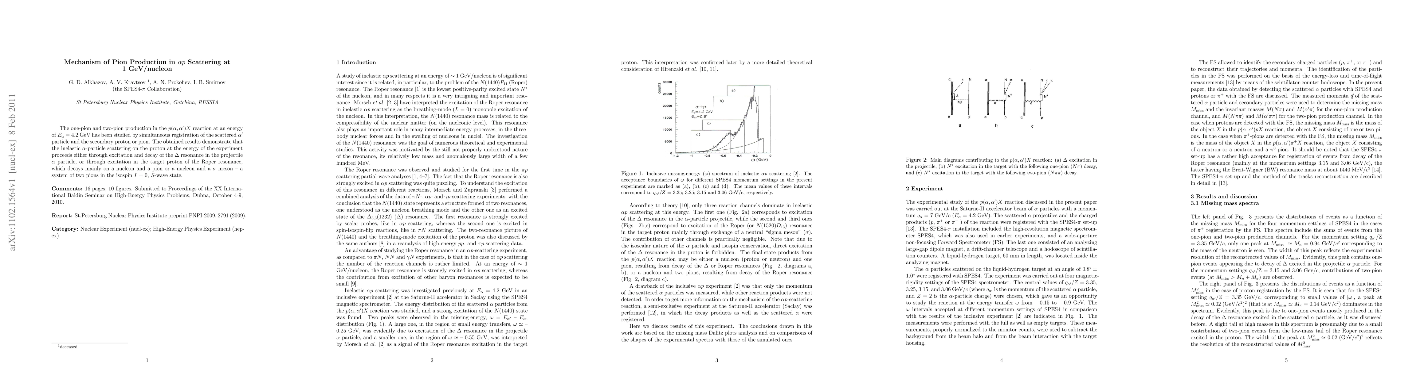 The one-pion and two-pion production in the p(alpha, alpha prime)X reaction at an energy of E{alpha} = 4.2 GeV has been studied by simultaneous registration of the scattered alpha particles and the secondary pion or proton. The obtained results demonstrate that the inelastic alpha-particle scattering on the proton at the energy of the experiment proceeds either through excitation and decay of Delta resonance in the projectile or through excitation in the target proton of the Roper resonance, which decays mainly on a nucleon and a pion or a nucleon and a sigma meson - system of two pions in the isospin I = 0, S-wave.