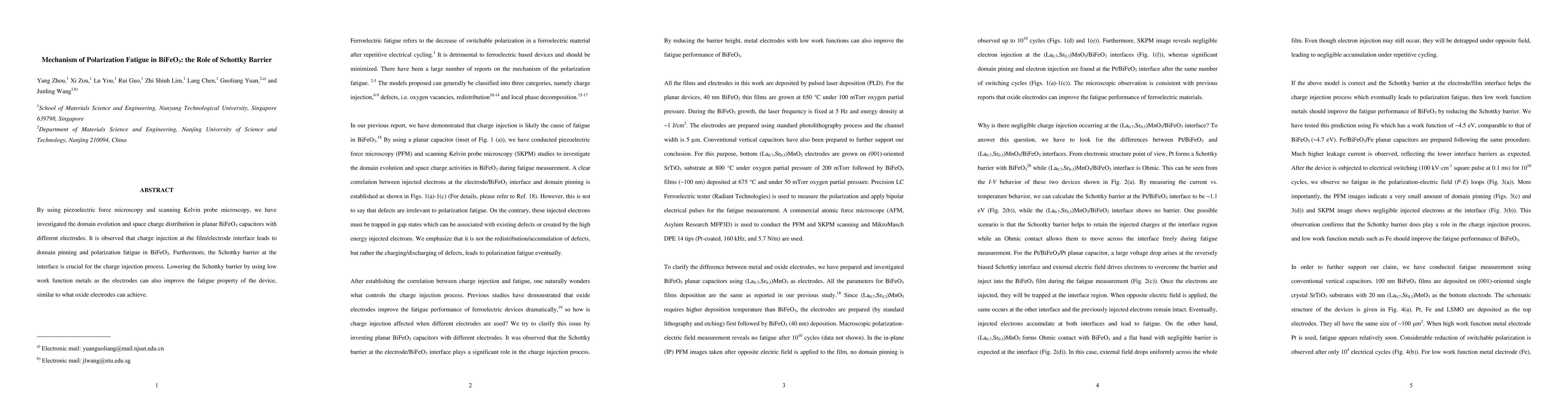 This study investigates domain evolution and space charge distribution in BiFeO3 capacitors, revealing that charge injection at the film/electrode interface causes domain pinning and polarization fatigue. The Schottky barrier at the interface is identified as a key factor in the charge injection process, with lower work function metals improving fatigue properties.