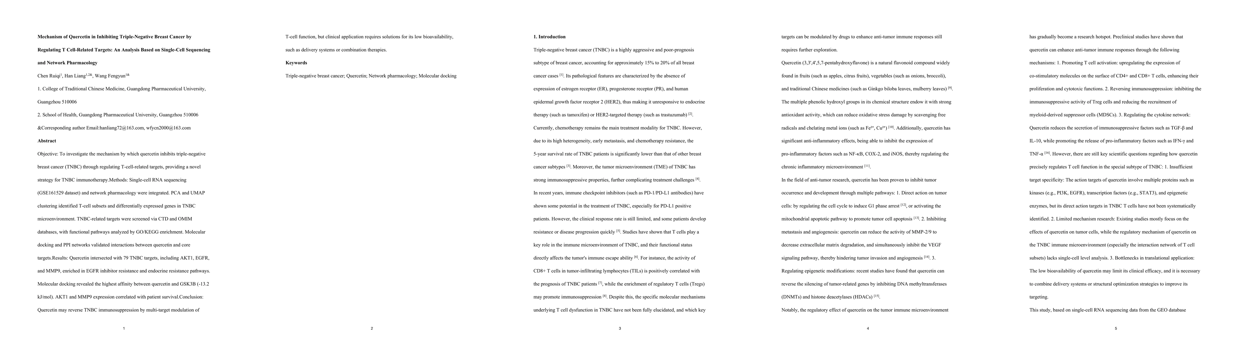 Objective: To investigate the mechanism by which quercetin inhibits triple-negative breast cancer (TNBC) through regulating T-cell-related targets, providing a novel strategy for TNBC immunotherapy.Methods: Single-cell RNA sequencing (GSE161529 dataset) and network pharmacology were integrated. PCA and UMAP clustering identified T-cell subsets and differentially expressed genes in TNBC microenvironment. TNBC-related targets were screened via CTD and OMIM databases, with functional pathways analyzed by GO/KEGG enrichment. Molecular docking and PPI networks validated interactions between quercetin and core targets.Results: Quercetin intersected with 79 TNBC targets, including AKT1, EGFR, and MMP9, enriched in EGFR inhibitor resistance and endocrine resistance pathways. Molecular docking revealed the highest affinity between quercetin and GSK3B (-13.2 kJ/mol). AKT1 and MMP9 expression correlated with patient survival.Conclusion: Quercetin may reverse TNBC immunosuppression by multi-target modulation of T-cell function, but clinical application requires solutions for its low bioavailability, such as delivery systems or combination therapies.