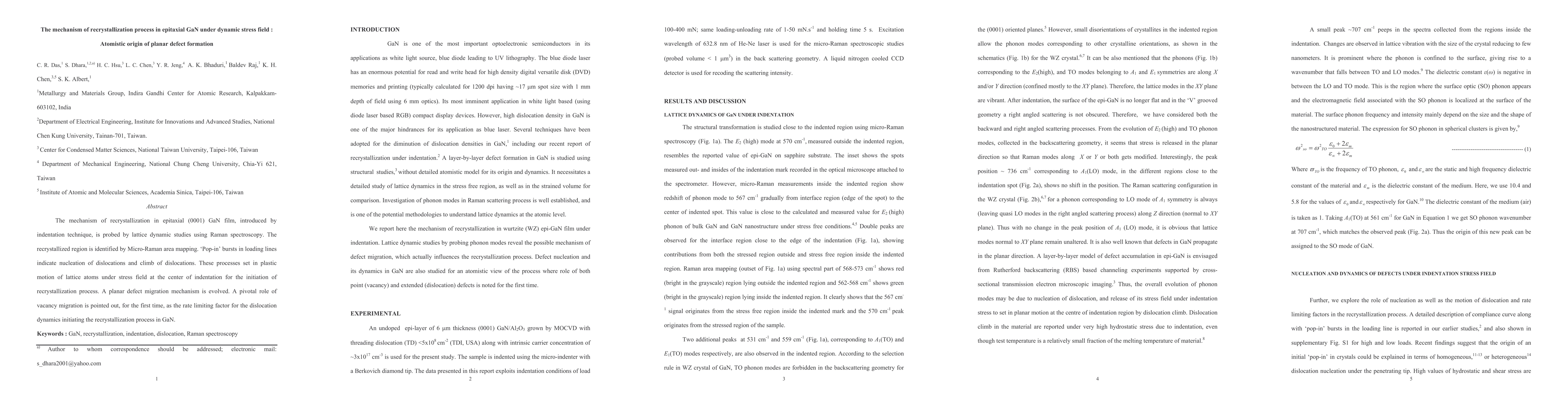 The mechanism of recrystallization in epitaxial (1000) GaN film, introduced by indentation technique, is probed by lattice dynamic studies using Raman spectroscopy. The recrystallized region is identified by Micro-Raman area mapping. Pop-in bursts in loading lines indicate nucleation of dislocations and climb of dislocations. These processes set in plastic motion of lattice atoms under stress field at the center of indentation for the initiation of recrystallization process. A planar defect migration mechanism is evolved. A pivotal role of vacancy migration is pointed out, for the first time, as the rate limiting factor for the dislocation dynamics initiating the recrystallization process in GaN.