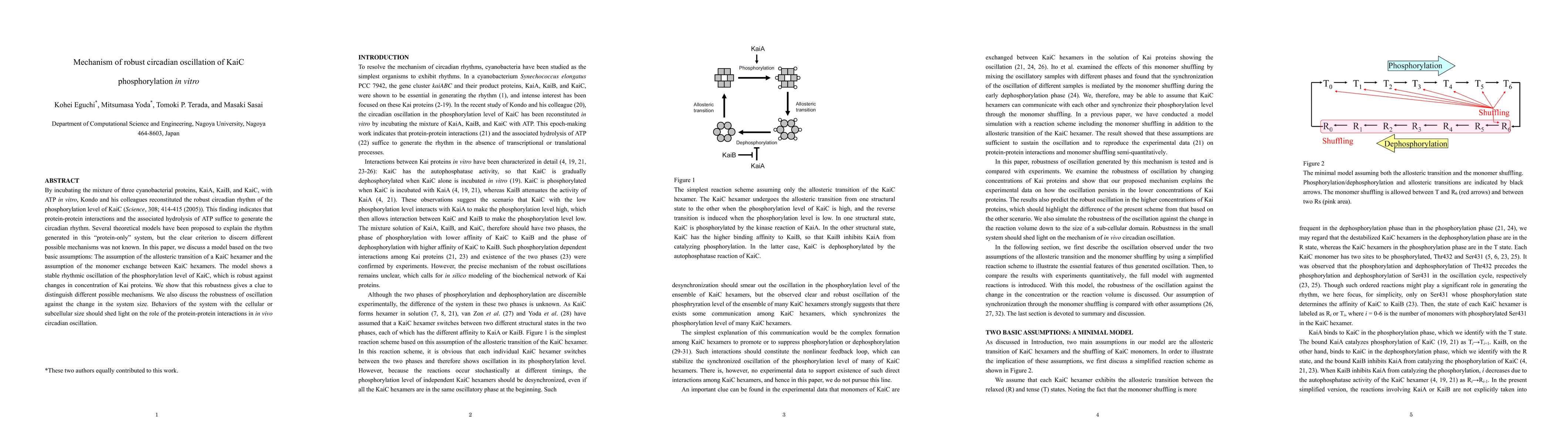 This paper proposes a model explaining the robust circadian oscillation of KaiC phosphorylation in vitro based on allosteric transitions of KaiC hexamers and monomer exchange. The model demonstrates stable rhythmic oscillations that are robust against variations in Kai protein concentrations, providing a criterion to distinguish between different mechanisms.