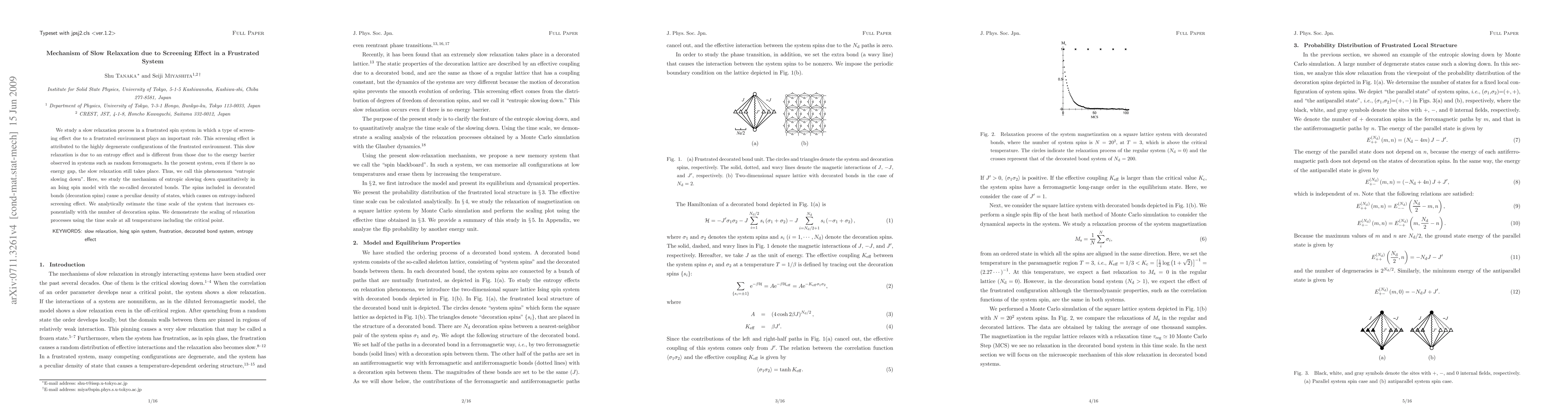 This paper investigates the mechanism of slow relaxation in a frustrated spin system, attributing it to an "entropic slowing down" due to a screening effect from highly degenerate configurations. The study uses an Ising spin model with decorated bonds to analytically estimate the exponential increase in the time scale of relaxation with the number of decoration spins, demonstrating the scaling of relaxation processes across all temperatures, including the critical point.