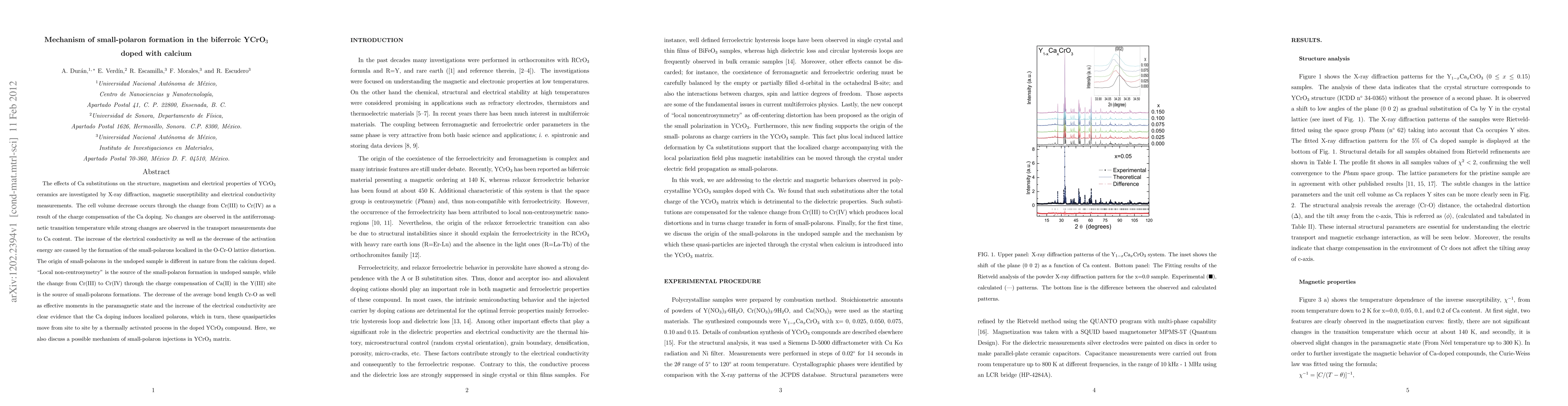 The effects of Ca substitutions on the structure, magnetism and electrical properties of YCrO3 ceramics are investigated by X-ray diffraction, magnetic susceptibility and electrical conductivity measurements. The cell volume decrease occurs through the change from Cr(III) to Cr(IV) as a result of the charge compensation of the Ca doping. No changes are observed in the antiferromagnetic transition temperature while strong changes are observed in the transport measurements due to Ca content. The increase of the electrical conductivity as well as the decrease of the activation energy are caused by the formation of the small-polarons localized in the O-Cr-O lattice distortion. The origin of small-polarons in the undoped sample is different in nature from the calcium doped. "Local non-centrosymetry" is the source of the small-polaron formation in undoped sample, while the change from Cr(III) to Cr(IV) through the charge compensation of Ca(II) in the Y(III) site is the source of small-polarons formations. The decrease of the average bond length Cr-O as well as effective moments in the paramagnetic state and the increase of the electrical conductivity are clear evidence that the Ca doping induces localized polarons, which in turn, these quasiparticles move from site to site by a thermally activated process in the doped YCrO3 compound. Here, we also discuss a possible mechanism of small-polaron injections in YCrO3 matrix.