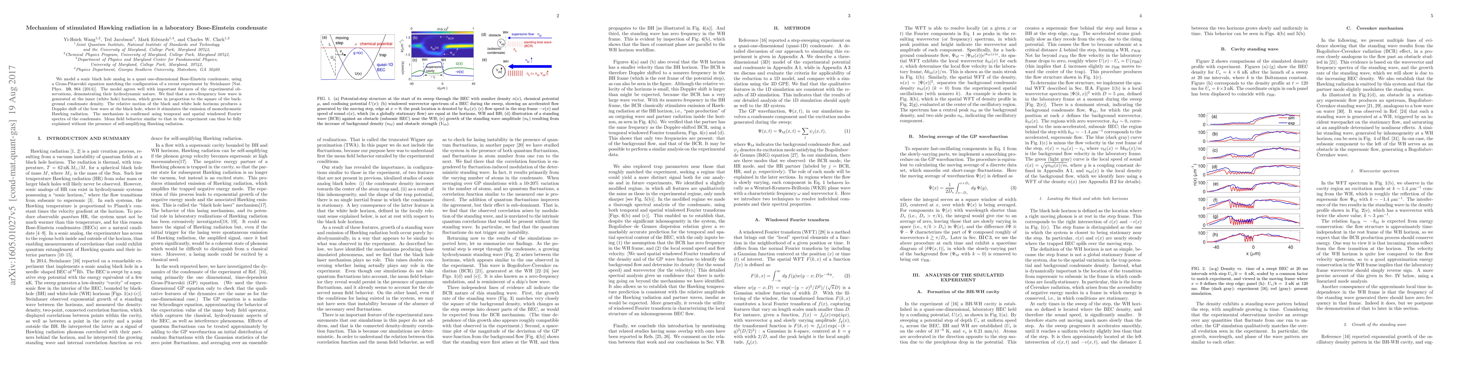 We model a sonic black hole analog in a quasi one-dimensional Bose-Einstein condensate, using a Gross-Pitaevskii equation matching the configuration of a recent experiment by Steinhauer [Nat. Phys. 10, 864 (2014)]. The model agrees well with important features of the experimental observations, demonstrating their hydrodynamic nature. We find that a zero-frequency bow wave is generated at the inner (white hole) horizon, which grows in proportion to the square of the background condensate density. The relative motion of the black and white hole horizons produces a Doppler shift of the bow wave at the black hole, where it stimulates the emission of monochromatic Hawking radiation. The mechanism is confirmed using temporal and spatial windowed Fourier spectra of the condensate. Mean field behavior similar to that in the experiment can thus be fully explained without the presence of self-amplifying Hawking radiation.