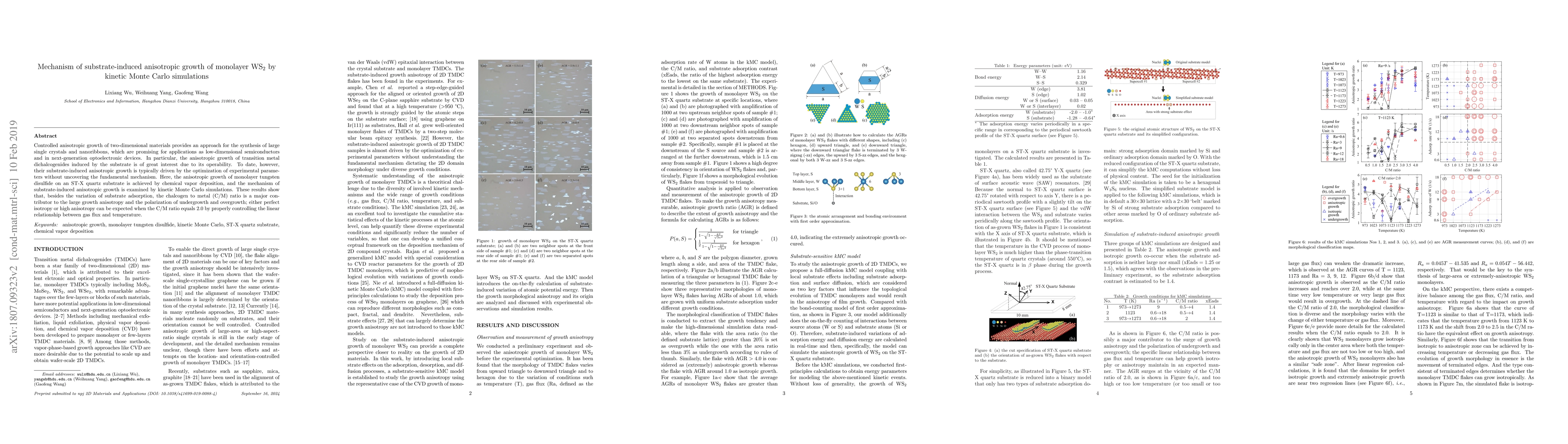 Researchers used kinetic Monte Carlo simulations to investigate how a substrate affects the growth of monolayer WS2, finding that controlling the C/M ratio can lead to anisotropic growth with high anisotropy achievable when the ratio equals 2.0.
