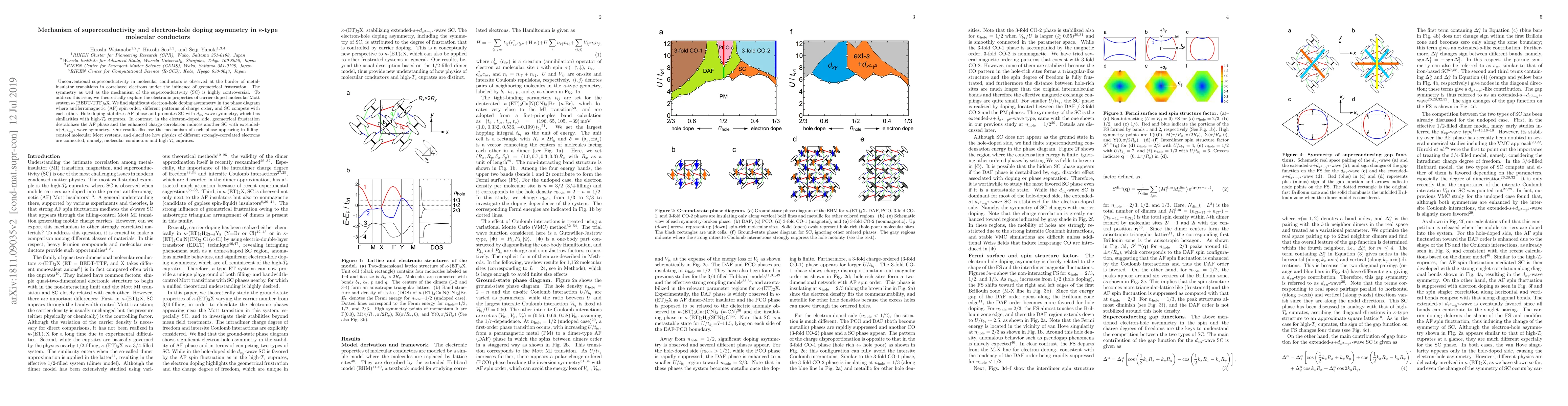 This paper investigates the unconventional superconductivity in $\kappa$-type molecular conductors, revealing significant electron-hole doping asymmetry. It finds that hole-doping promotes "$d_{xy}$"-wave symmetry superconductivity, while electron-doping leads to "extended-$s$+$d_{x^2-y^2}$"-wave symmetry superconductivity, elucidating the underlying mechanisms and connections to high-$T_c$ cuprates.
