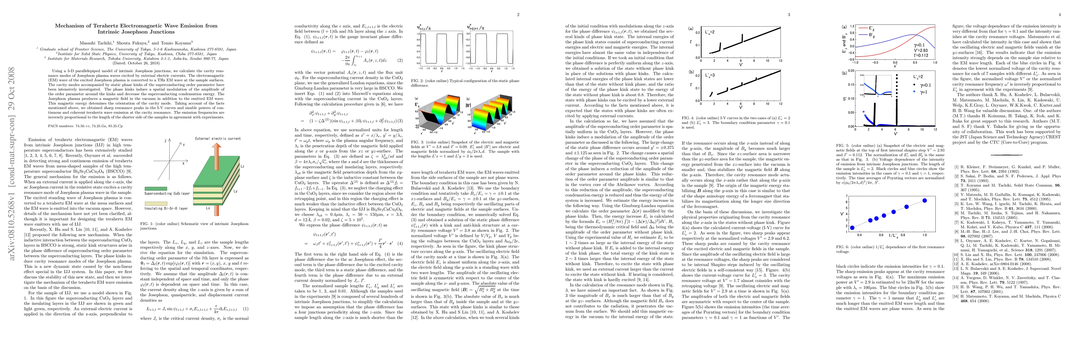 This paper investigates the mechanism of terahertz electromagnetic wave emission from intrinsic Josephson junctions using a 3-D model. It finds that cavity resonance modes of Josephson plasma waves, influenced by static phase kinks and magnetic field effects, lead to sharp resonance peaks and significant continuous terahertz wave emission, with frequencies inversely proportional to the sample's shorter side length.