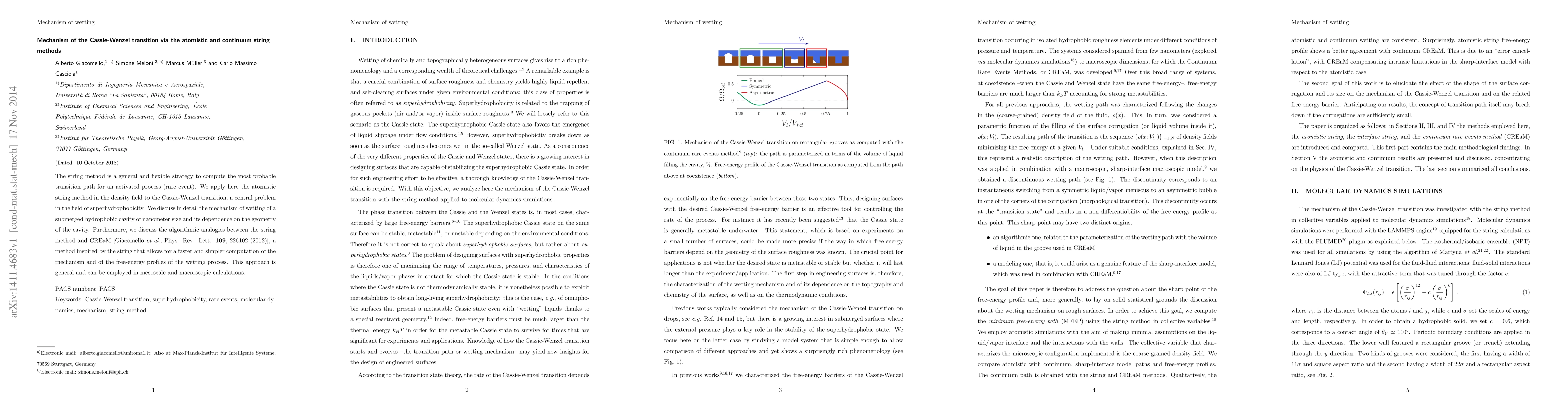 This paper explores the Cassie-Wenzel transition mechanism using atomistic and continuum string methods, focusing on the wetting of nanometer-sized hydrophobic cavities. It also compares the string method with CREaM, highlighting algorithmic similarities for efficient computation of wetting processes at various scales.