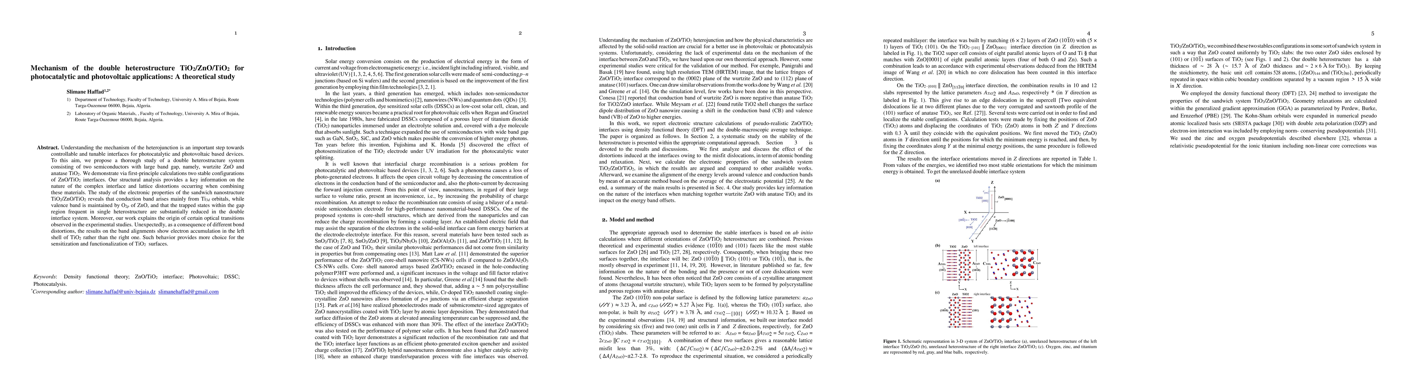 This study investigates the double heterostructure TiO2/ZnO/TiO2 using first-principle calculations, revealing two stable configurations for the ZnO/TiO2 interfaces. The analysis shows reduced trapped states and distinct electron accumulation in the left shell of TiO2, offering enhanced photocatalytic and photovoltaic potential.