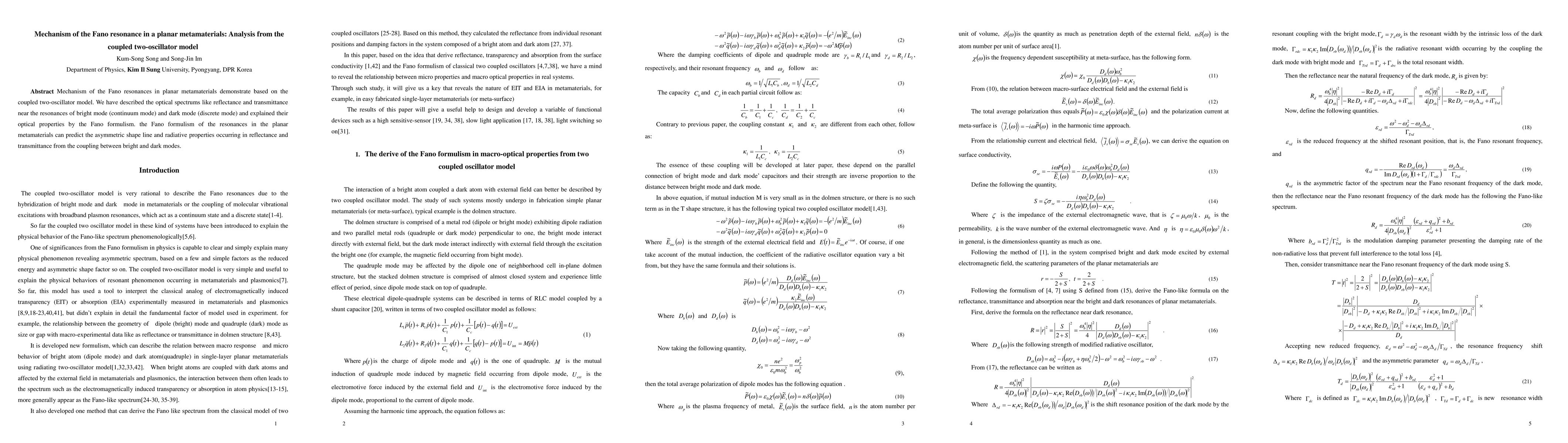 This paper investigates the mechanism of Fano resonances in planar metamaterials using a coupled two-oscillator model, explaining the optical properties of bright and dark modes and predicting the asymmetric spectral line shapes in reflectance and transmittance due to their interaction.