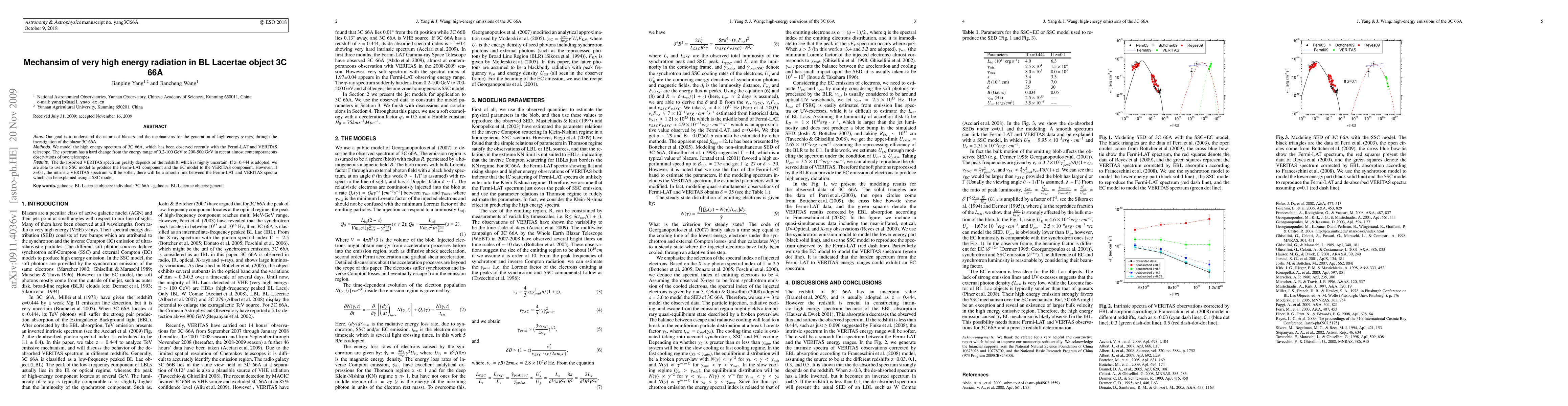 Our goal is to understand the nature of blazars and the mechanisms for the generation of high-energy $\gamma$-rays, through the investigation of the blazar 3C 66A. We model the high energy spectrum of 3C 66A, which has been observed recently with the Fermi-LAT and VERITAS telescope. The spectrum has a hard change from the energy range of 0.2-100 GeV to 200-500 GeV in recent almost contemporaneous observations of two telescopes. The de-absorbed VERITAS spectrum greatly depends on the redshift, which is highly uncertain. If z=0.444 is adopted, we are able to use the SSC model to produce the Fermi-LAT component and the EC model to the VERITAS component. However, if z=0.1, the intrinsic VERITAS spectrum will be softer, there will be a smooth link between the Fermi-LAT and VERITAS spectra which can be explained using a SSC model.