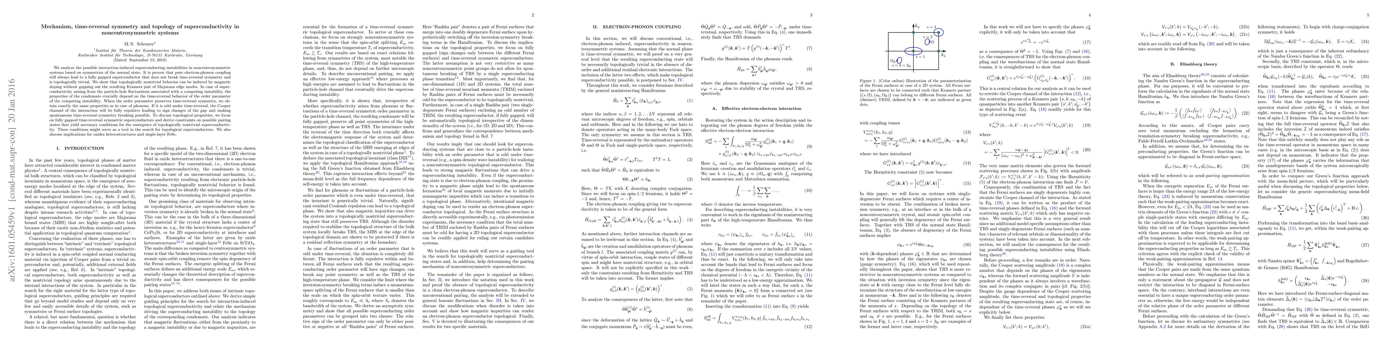 We analyze the possible interaction-induced superconducting instabilities in noncentrosymmetric systems based on symmetries of the normal state. It is proven that pure electron-phonon coupling will always lead to a fully gapped superconductor that does not break time-reversal symmetry and is topologically trivial. We show that topologically nontrivial behavior can be induced by magnetic doping without gapping out the resulting Kramers pair of Majorana edge modes. In case of superconductivity arising from the particle-hole fluctuations associated with a competing instability, the properties of the condensate crucially depend on the time-reversal behavior of the order parameter of the competing instability. When the order parameter preserves time-reversal symmetry, we obtain exactly the same properties as in case of phonons. If it is odd under time-reversal, the Cooper channel of the interaction will be fully repulsive leading to sign changes of the gap and making spontaneous time-reversal symmetry breaking possible. To discuss topological properties, we focus on fully gapped time-reversal symmetric superconductors and derive constraints on possible pairing states that yield necessary conditions for the emergence of topologically nontrivial superconductivity. These conditions might serve as a tool in the search for topological superconductors. We also discuss implications for oxides heterostructures and single-layer FeSe.