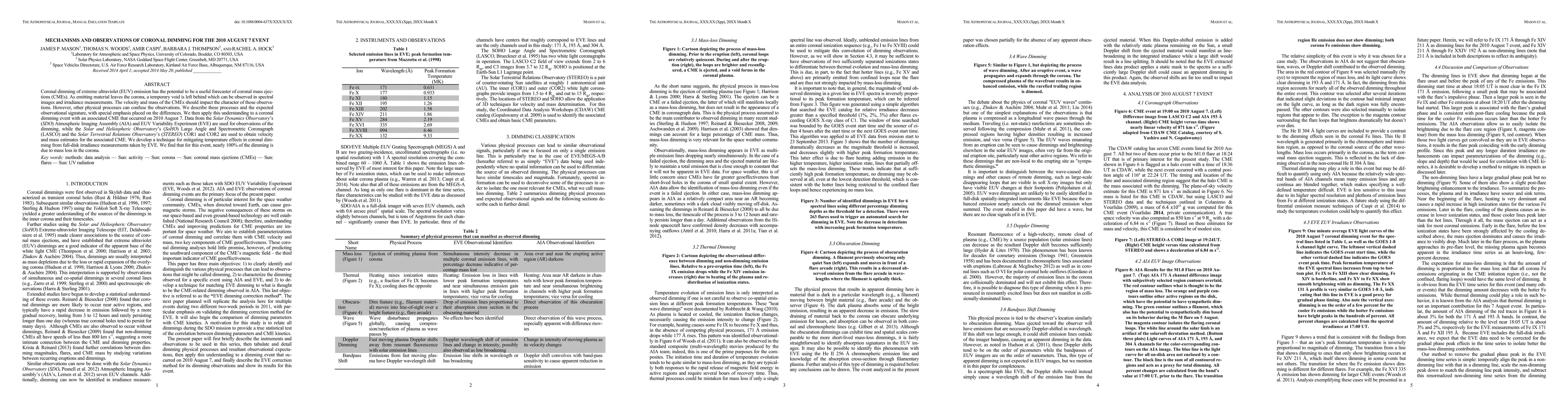 Coronal dimming of extreme ultraviolet (EUV) emission has the potential to be a useful forecaster of coronal mass ejections (CMEs). As emitting material leaves the corona, a temporary void is left behind which can be observed in spectral images and irradiance measurements. The velocity and mass of the CMEs should impact the character of those observations. However, other physical processes can confuse the observations. We describe these processes and the expected observational signature, with special emphasis placed on the differences. We then apply this understanding to a coronal dimming event with an associated CME that occurred on 2010 August 7. Data from the Solar Dynamics Observatory's (SDO) Atmospheric Imaging Assembly (AIA) and EUV Variability Experiment (EVE) are used for observations of the dimming, while the Solar and Heliospheric Observatory's (SOHO) Large Angle and Spectrometric Coronagraph (LASCO) and the Solar Terrestrial Relations Observatory's (STEREO) COR1 and COR2 are used to obtain velocity and mass estimates for the associated CME. We develop a technique for mitigating temperature effects in coronal dimming from full-disk irradiance measurements taken by EVE. We find that for this event, nearly 100% of the dimming is due to mass loss in the corona.