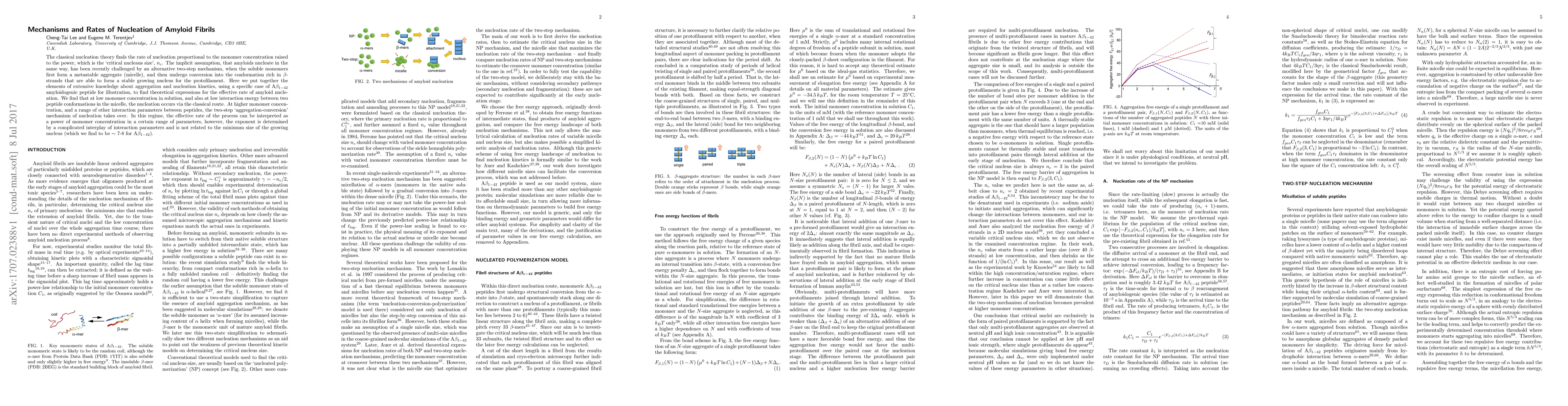 The classical nucleation theory finds the rate of nucleation proportional to the monomer concentration raised to the power, which is the `critical nucleaus size', ${n_c}$. The implicit assumption, that amyloids nucleate in the same way, has been recently challenged by an alternative two-step mechanism, when the soluble monomers first form a metastable aggregate (micelle), and then undergo conversion into the conformation rich in ${\beta}$-strands that are able to form a stable growing nucleus for the protofilament. Here we put together the elements of extensive knowledge about aggregation and nucleation kinetics, using a specific case of A${\beta_{1\mathrm{-}42}}$ amyloidogenic peptide for illustration, to find theoretical expressions for the effective rate of amyloid nucleation. We find that at low monomer concentration in solution, and also at low interaction energy between two peptide conformations in the micelle, the nucleation occurs via the classical route. At higher monomer concentration, and a range of other interaction parameters between peptides, the two-step `aggregation-conversion' mechanism of nucleation takes over. In this regime, the effective rate of the process can be interpreted as a power of monomer concentration in a certain range of parameters, however, the exponent is determined by a complicated interplay of interaction parameters and is not related to the minimum size of the growing nucleus (which we find to be ${\sim}$ 7-8 for A${\beta_{1-42}}$).