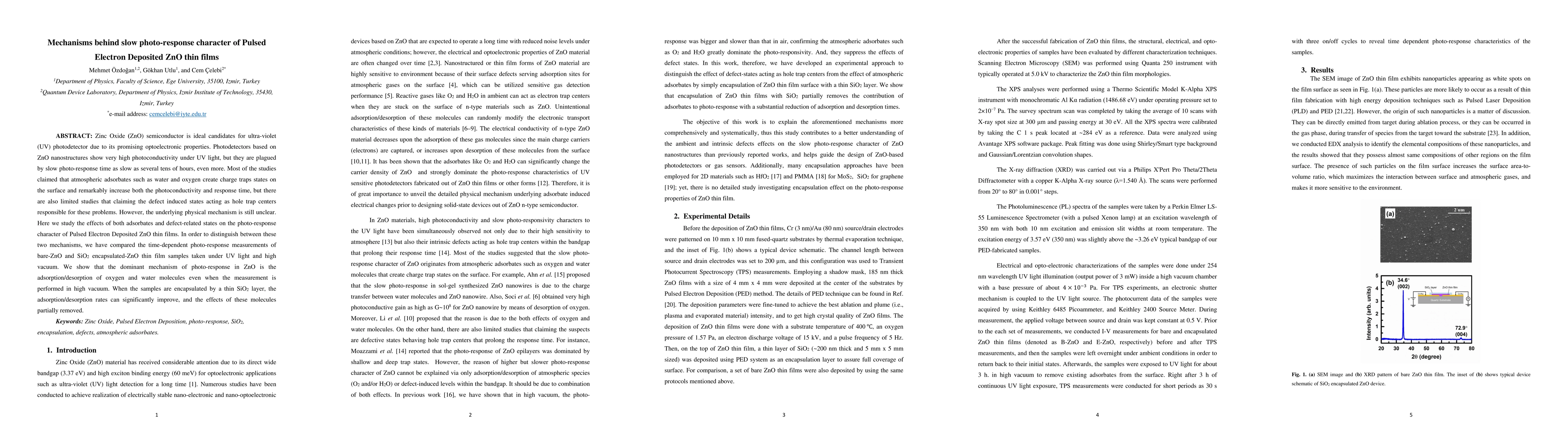 Zinc Oxide (ZnO) semiconductor is ideal candidates for ultra-violet (UV) photodetector due to its promising optoelectronic properties. Photodetectors based on ZnO nanostructures show very high photoconductivity under UV light, but they are plagued by slow photo-response time as slow as several tens of hours, even more. Most of the studies claimed that atmospheric adsorbates such as water and oxygen create charge traps states on the surface and remarkably increase both the photoconductivity and response time, but there are also limited studies that claiming the defect induced states acting as hole trap centers responsible for these problems. However, the underlying physical mechanism is still unclear. Here we study the effects of both adsorbates and defect-related states on the photo-response character of Pulsed Electron Deposited ZnO thin films. In order to distinguish between these two mechanisms, we have compared the time-dependent photo-response measurements of bare-ZnO and SiO2 encapsulated-ZnO thin film samples taken under UV light and high vacuum. We show that the dominant mechanism of photo-response in ZnO is the adsorption/desorption of oxygen and water molecules even when the measurement is performed in high vacuum. When the samples are encapsulated by a thin SiO2 layer, the adsorption/desorption rates can significantly improve, and the effects of these molecules partially removed.