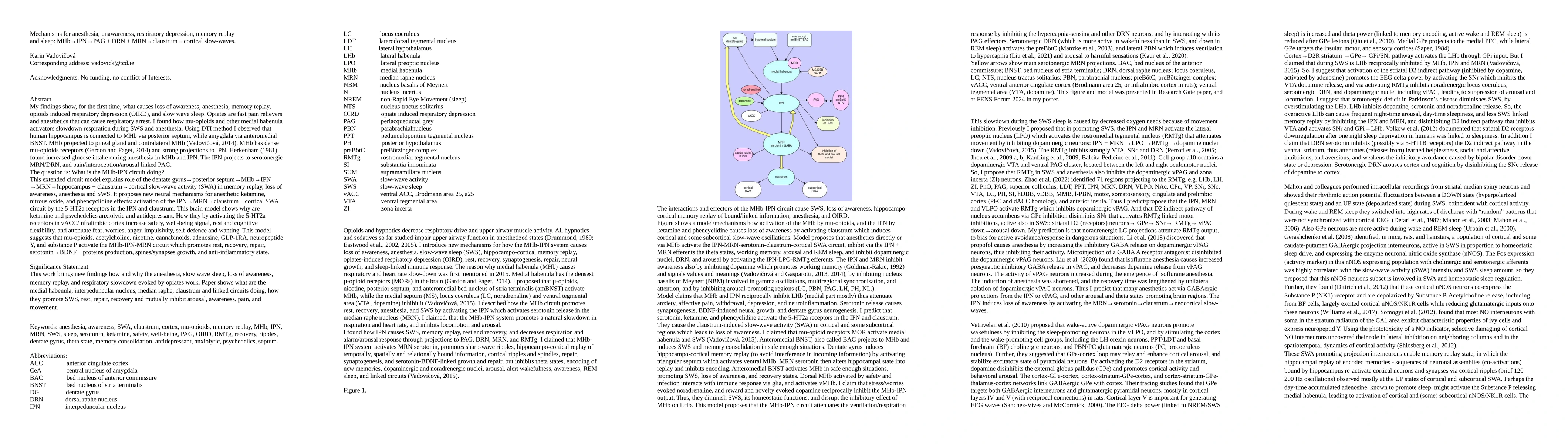 My findings show, for the first time, what causes loss of awareness, anesthesia, memory replay, opioids induced respiratory depression (OIRD), and slow wave sleep. Opiates are fast pain relievers and anesthetics that can cause respiratory arrest. I found how mu-opioids and other medial habenula activators slowdown respiration during SWS and anesthesia. Using DTI method I observed that human hippocampus is connected to MHb via posterior septum, while amygdala via anteromedial BNST. MHb projected to pineal gland and contralateral MHb (Vadovi\v{c}ov\'a, 2014). MHb has dense mu-opioids receptors (Gardon and Faget, 2014) and strong projections to IPN. Herkenham (1981) found increased glucose intake during anesthesia in MHb and IPN. The IPN projects to serotonergic MRN/DRN, and pain/interoception/arousal linked PAG. The question is: What is the MHb-IPN circuit doing? This extended circuit model explains role of the dentate gyrus >posterior septum >MHb >IPN >MRN >hippocampus + BF + claustrum >cortical slow-wave activity (SWA) in memory replay, loss of awareness, anesthesia and SWS. It proposes new neural mechanisms for anesthetic ketamine, nitrous oxide, and phencyclidine effects: activation of the IPN >MRN >claustrum >cortical SWA circuit by the 5-HT2a receptors in the IPN and claustrum. This brain model shows why are ketamine and psychedelics anxiolytic and antidepressant. How they by activating the 5-HT2a receptors in vACC/infralimbic cortex increase safety, well-being signal, socializing, and cognitive flexibility, and attenuate fear, worries, anger, impulsivity, self-defence and wanting. This model suggests that mu-opioids, acetylcholine, nicotine, cannabinoids, adenosine, GLP-1RA, neuropeptide Y, and substance P activate the MHb-IPN-MRN circuit which promotes rest, recovery, repair, serotonin-BDNF-proteins production-spines/synapses growth-anti-inflammatory state.