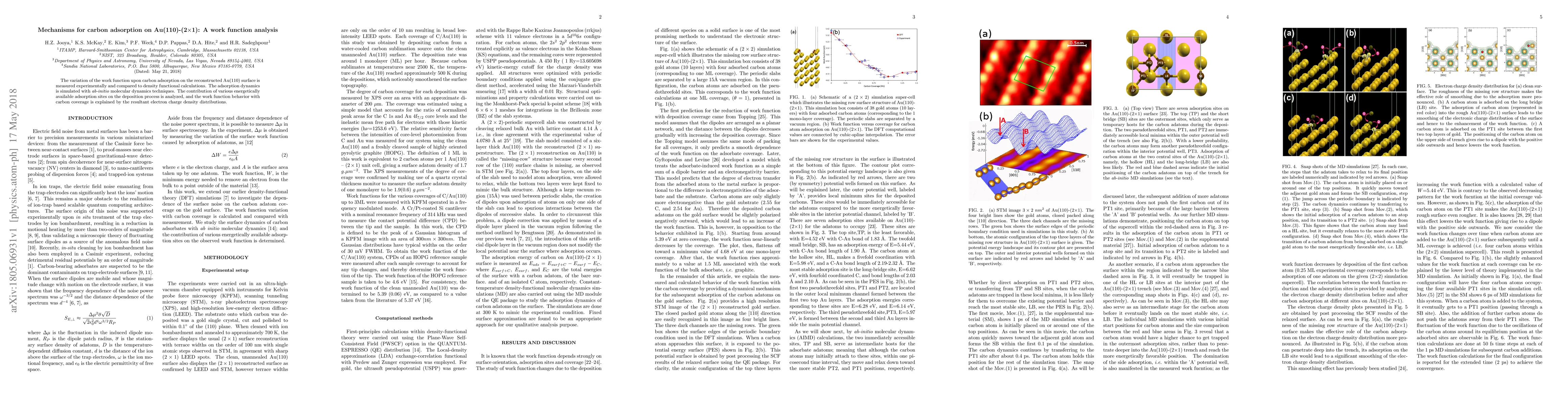 This study measures the work function change due to carbon adsorption on Au(110) surface, combining experimental results with density functional calculations and ab-initio molecular dynamics to analyze adsorption dynamics and explain work function behavior through electron charge density distributions.