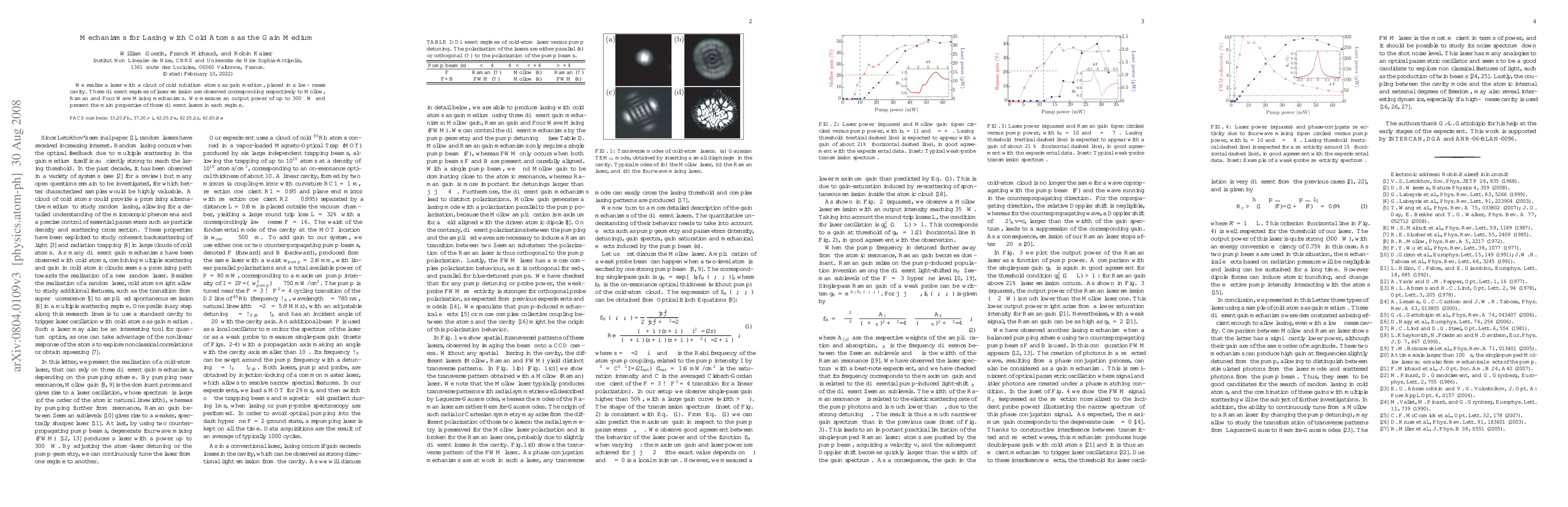 This paper demonstrates a laser using a cold rubidium atom cloud as the gain medium, observing three lasing regimes based on Mollow, Raman, and Four Wave Mixing mechanisms, achieving an output power of up to 300 $\mu$W, and detailing the characteristics of each regime.