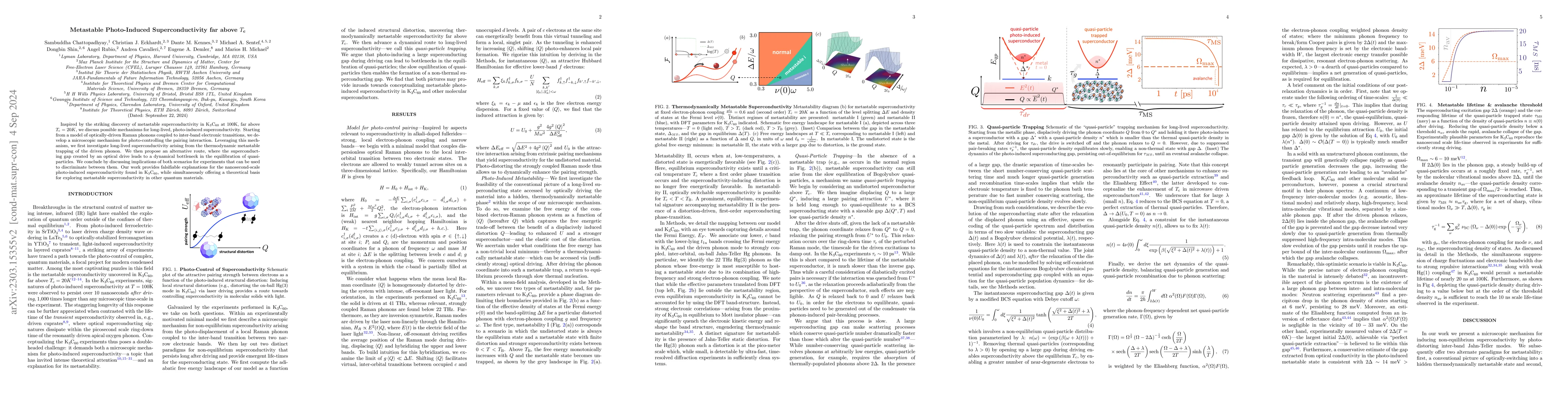 This paper explores the mechanisms for long-lived, photo-induced superconductivity in $\mathrm{K}_3\mathrm{C}_{60}$ above its critical temperature, proposing two models: one involving metastable phonon trapping and another based on quasi-particle equilibration. Both scenarios offer theoretical insights into non-equilibrium superconductivity and suggest experimental tests to distinguish between them.
