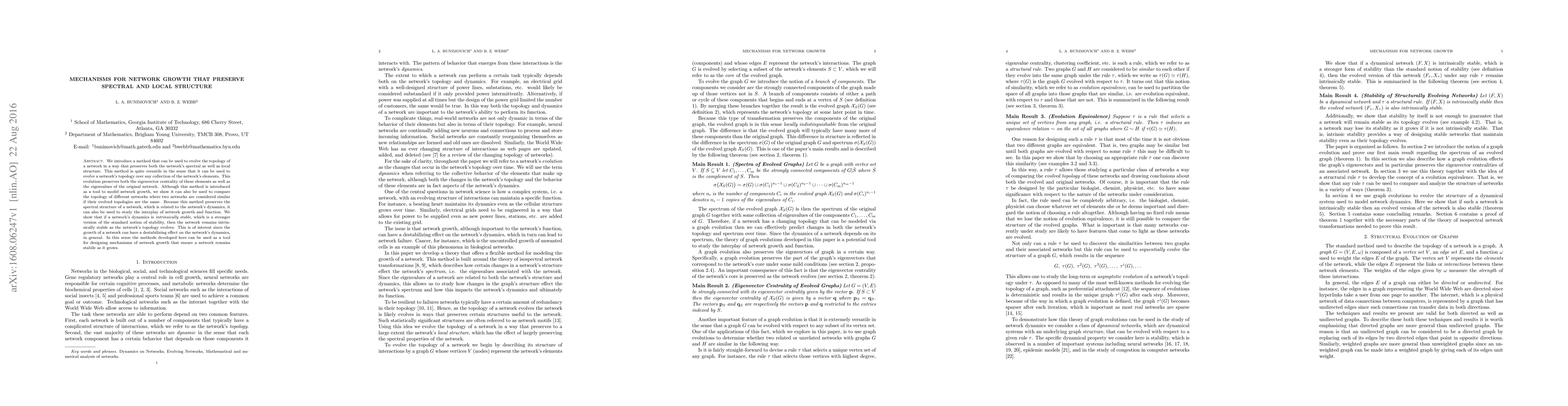We introduce a method that can be used to evolve the topology of a network in a way that preserves both the network's spectral as well as local structure. This method is quite versatile in the sense that it can be used to evolve a network's topology over any collection of the network's elements. This evolution preserves both the eigenvector centrality of these elements as well as the eigenvalues of the original network. Although this method is introduced as a tool to model network growth, we show it can also be used to compare the topology of different networks where two networks are considered similar if their evolved topologies are the same. Because this method preserves the spectral structure of a network, which is related to the network's dynamics, it can also be used to study the interplay of network growth and function. We show that if a network's dynamics is intrinsically stable, which is a stronger version of the standard notion of stability, then the network remains intrinsically stable as the network's topology evolves. This is of interest since the growth of a network can have a destabilizing effect on the network's dynamics, in general. In this sense the methods developed here can be used as a tool for designing mechanisms of network growth that ensure a network remains stabile as it grows.