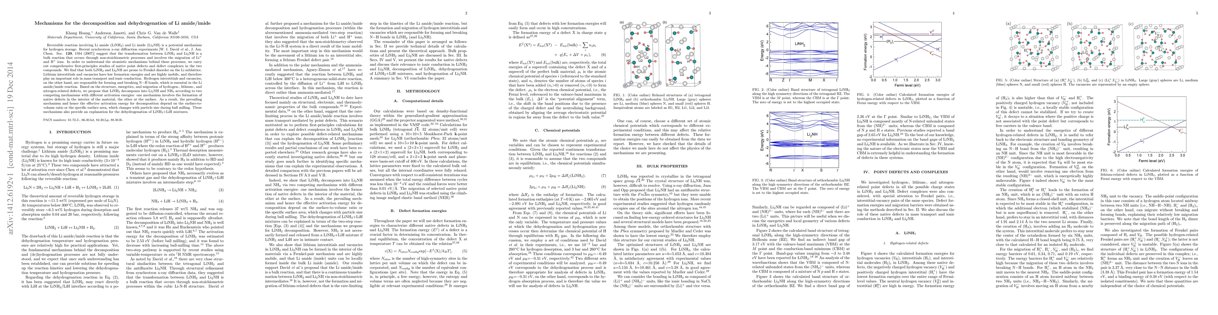 Reversible reaction involving Li amide (LiNH$_{2}$) and Li imide (Li$_{2}$NH) is a potential mechanism for hydrogen storage. Recent synchrotron x-ray diffraction experiments [W. I. David et al., J. Am. Chem. Soc. 129, 1594 (2007)] suggest that the transformation between LiNH$_{2}$ and Li$_{2}$NH is a bulk reaction that occurs through non-stoichiometric processes and involves the migration of Li$^{+}$ and H$^{+}$ ions. In order to understand the atomistic mechanisms behind these processes, we carry out comprehensive first-principles studies of native point defects and defect complexes in the two compounds. We find that both LiNH$_{2}$ and Li$_{2}$NH are prone to Frenkel disorder on the Li sublattice. Lithium interstitials and vacancies have low formation energies and are highly mobile, and therefore play an important role in mass transport and ionic conduction. Hydrogen interstitials and vacancies, on the other hand, are responsible for forming and breaking N$-$H bonds, which is essential in the Li amide/imide reaction. Based on the structure, energetics, and migration of hydrogen-, lithium-, and nitrogen-related defects, we propose that LiNH$_{2}$ decomposes into Li$_{2}$NH and NH$_{3}$ according to two competing mechanisms with different activation energies: one mechanism involves the formation of native defects in the interior of the material, the other at the surface. As a result, the prevailing mechanism and hence the effective activation energy for decomposition depend on the surface-to-volume ratio or the specific surface area, which changes with particle size during ball milling. These mechanisms also provide an explanation for the dehydrogenation of LiNH$_{2}$+LiH mixtures.