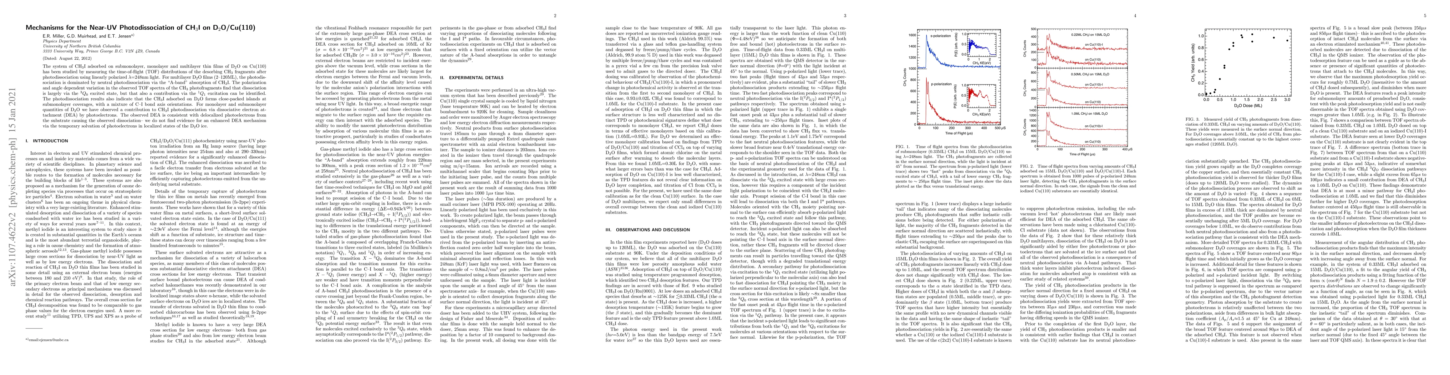 The system of CH$_3$I adsorbed on submonolayer, monolayer and multilayer thin films of D$_2$O on Cu(110) has been studied by measuring the time-of-flight (TOF) distributions of the desorbing CH$_3$ fragments after photodissociation using linearly polarized $\lambda$=248nm light. For multilayer D$_2$O films (1-120ML), the photodissociation is dominated by neutral photodissociation via the "A-band" absorption of CH$_3$I. The polarization and angle dependent variation in the observed TOF spectra of the CH$_3$ photofragments find that dissociation is largely via the $^3Q_0$ excited state, but that also a contribution via the $^1Q_1$ excitation can be identified. The photodissociation results also indicate that the CH$_3$I adsorbed on D$_2$O forms close-packed islands at submonolayer coverages, with a mixture of C-I bond axis orientations. For submonolayer quantities of D$_2$O we have observed a contribution to CH$_3$I photodissociation via dissociative electron attachment (DEA) by photoelectrons. The observed DEA is consistent with delocalized photoelectrons from the substrate causing the observed dissociation -- we do not find evidence for a DEA mechanism via the temporary solvation of photoelectrons in localized states of the D$_2$O ice.