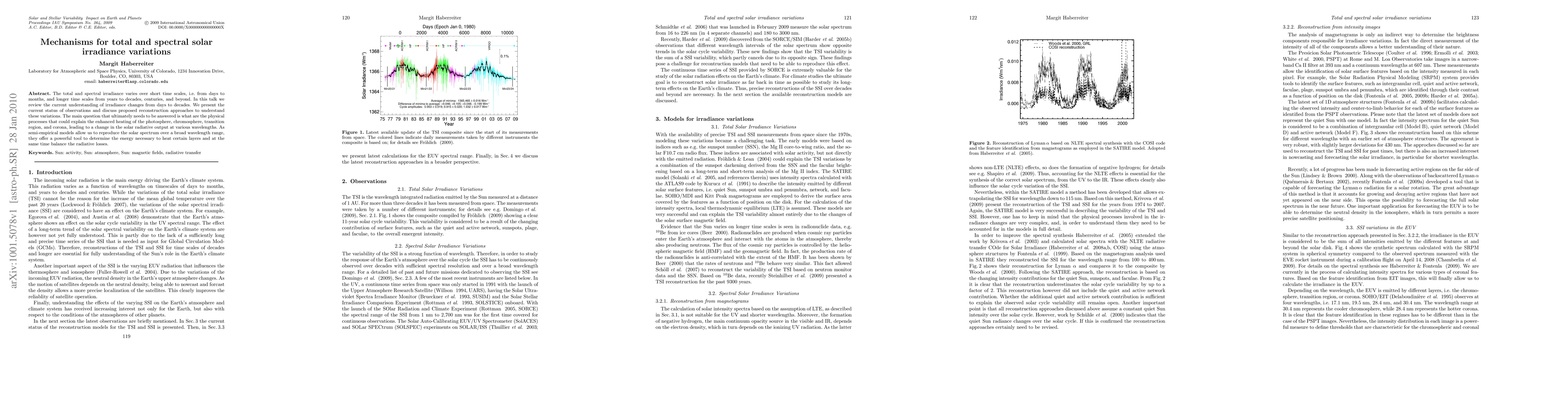 This paper reviews the mechanisms behind variations in total and spectral solar irradiance over different time scales, from days to decades. It discusses current observational data and reconstruction methods, aiming to identify the physical processes that enhance heating in solar layers, ultimately affecting solar radiative output.