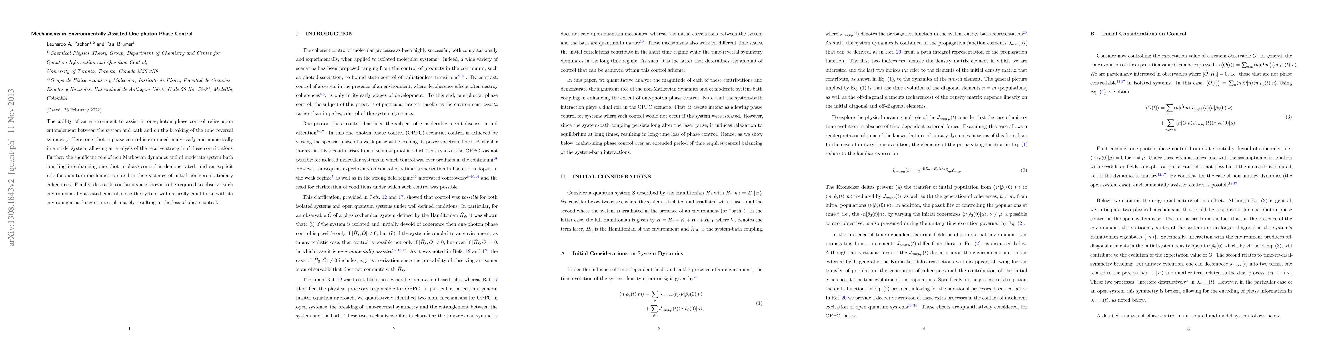 This paper investigates the mechanisms behind environmentally-assisted one-photon phase control, emphasizing the role of entanglement, time reversal symmetry breaking, and non-Markovian dynamics. It demonstrates that moderate system-bath coupling enhances phase control, but warns that long-term equilibration will eventually lead to its loss.