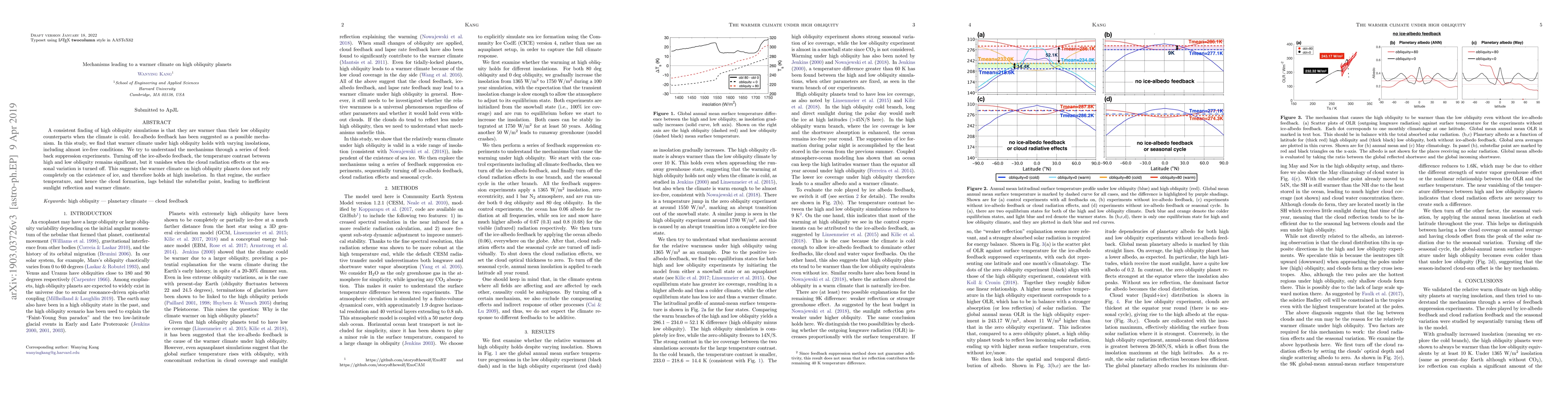 A consistent finding of high obliquity simulations is that they are warmer than their low obliquity counterparts when the climate is cold. Ice-albedo feedback has been suggested as a possible mechanism. In this study, we find that warmer climate under high obliquity holds with varying insolations, including almost ice-free conditions. We try to understand the mechanisms through a series of feedback suppression experiments. Turning off the ice-albedo feedback, the temperature contrast between high and low obliquity remains significant, but it vanishes when the cloud radiation effects or the seasonal variation is turned off. This suggests the warmer climate on high obliquity planets does not rely completely on the existence of ice, and therefore holds at high insolation. In that regime, the surface temperature, and hence the cloud formation, lags behind the substellar point, leading to inefficient sunlight reflection and warmer climate.