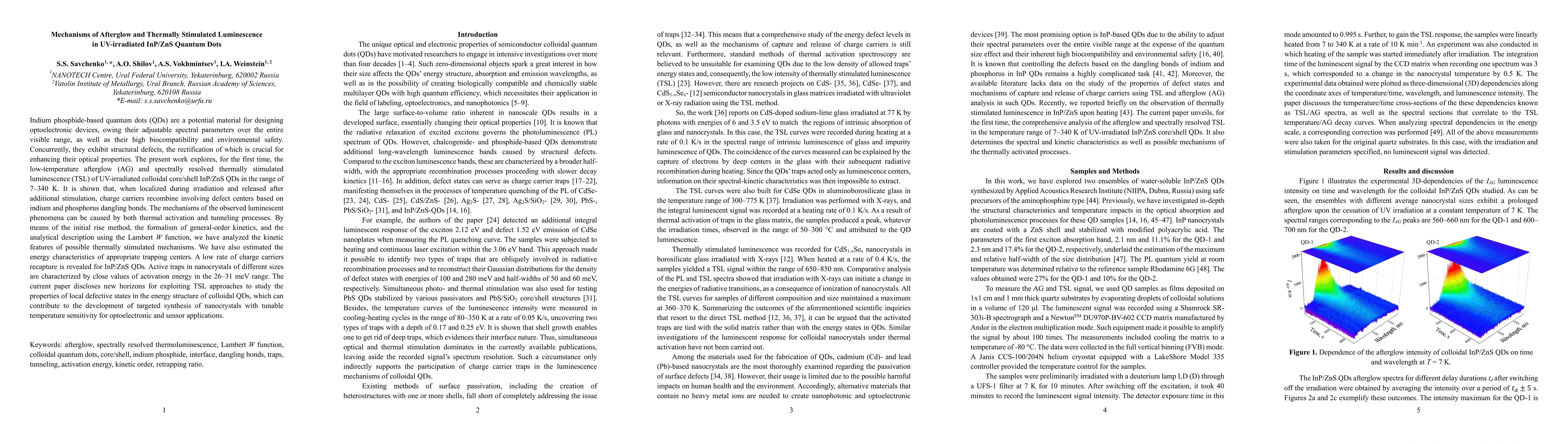 Indium phosphide-based quantum dots (QDs) are a potential material for designing optoelectronic devices, owing their adjustable spectral parameters over the entire visible range, as well as their high biocompatibility and environmental safety. Concurrently, they exhibit structural defects, the rectification of which is crucial for enhancing their optical properties. The present work explores, for the first time, the low-temperature afterglow (AG) and spectrally resolved thermally stimulated luminescence (TSL) of UV-irradiated colloidal core/shell InP/ZnS QDs in the range of 7-340 K. It is shown that, when localized during irradiation and released after additional stimulation, charge carriers recombine involving defect centers based on indium and phosphorus dangling bonds. The mechanisms of the observed luminescent phenomena can be caused by both thermal activation and tunneling processes. By means of the initial rise method, the formalism of general-order kinetics, and the analytical description using the Lambert W function, we have analyzed the kinetic features of possible thermally stimulated mechanisms. We have also estimated the energy characteristics of appropriate trapping centers. A low rate of charge carriers recapture is revealed for InP/ZnS QDs. Active traps in nanocrystals of different sizes are characterized by close values of activation energy in the 26-31 meV range. The current paper discloses new horizons for exploiting TSL approaches to study the properties of local defective states in the energy structure of colloidal QDs, which can contribute to the development of targeted synthesis of nanocrystals with tunable temperature sensitivity for optoelectronic and sensor applications.