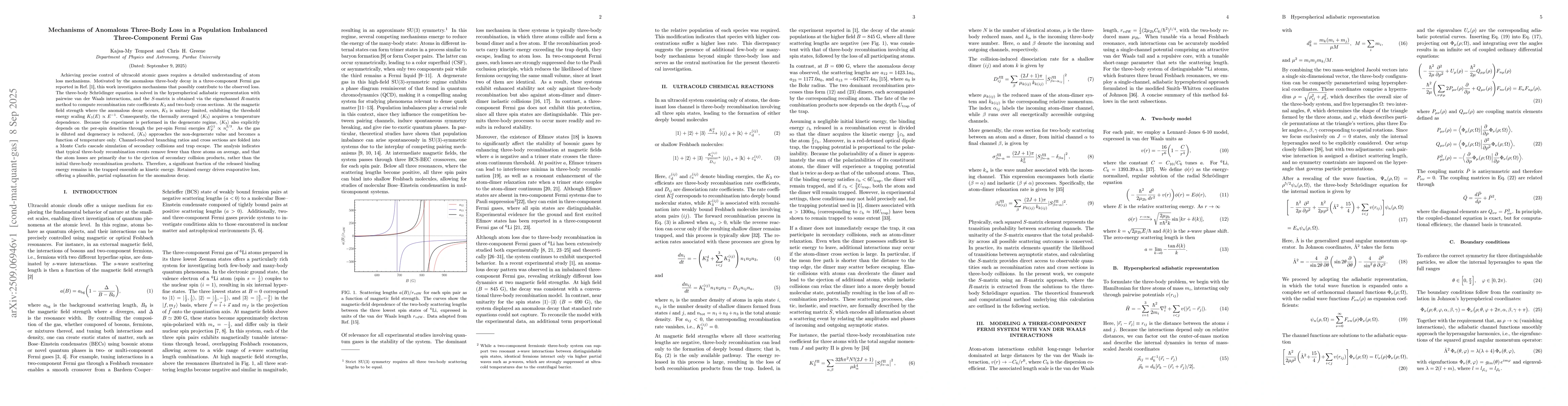 Achieving precise control of ultracold atomic gases requires a detailed understanding of atom loss mechanisms. Motivated by the anomalous three-body decay in a three-component Fermi gas reported in Ref. [1], this work investigates mechanisms that possibly contribute to the observed loss. The three-body Schr\"odinger equation is solved in the hyperspherical adiabatic representation with pairwise van der Waals interactions, and the $S$-matrix is obtained via the eigenchannel $R$-matrix method to compute recombination rate coefficients $K_3$ and two-body cross sections. At the magnetic field strength where the anomalous decay occurs, $K_3$ is unitary limited, exhibiting the threshold energy scaling $K_3(E)\propto E^{-1}$. Consequently, the thermally averaged $\langle K_3 \rangle$ acquires a temperature dependence. Because the experiment is performed in the degenerate regime, $\langle K_3 \rangle$ also explicitly depends on the per-spin densities through the per-spin Fermi energies $E_{F}^{(i)}\propto n_i^{2/3}$. As the gas is diluted and degeneracy is reduced, $\langle K_3 \rangle$ approaches the non-degenerate value and becomes a function of temperature only. Channel-resolved branching ratios and cross sections are folded into a Monte Carlo cascade simulation of secondary collisions and trap escape. The analysis indicates that typical three-body recombination events remove fewer than three atoms on average, and that the atom losses are primarily due to the ejection of secondary collision products, rather than the initial three-body recombination products. Therefore, a significant fraction of the released binding energy remains in the trapped ensemble as kinetic energy. Retained energy drives evaporative loss, offering a plausible, partial explanation for the anomalous decay.