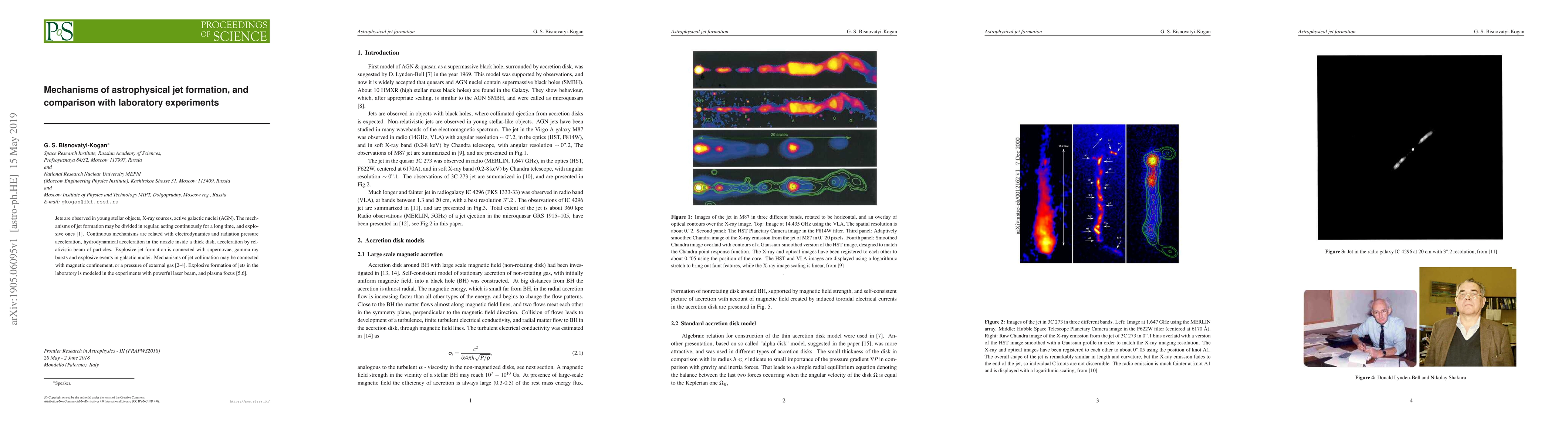 This paper explores the mechanisms behind astrophysical jet formation in various cosmic phenomena, distinguishing between continuous and explosive processes. It also compares these mechanisms with laboratory experiments using powerful lasers and plasma focus to simulate explosive jet formation.