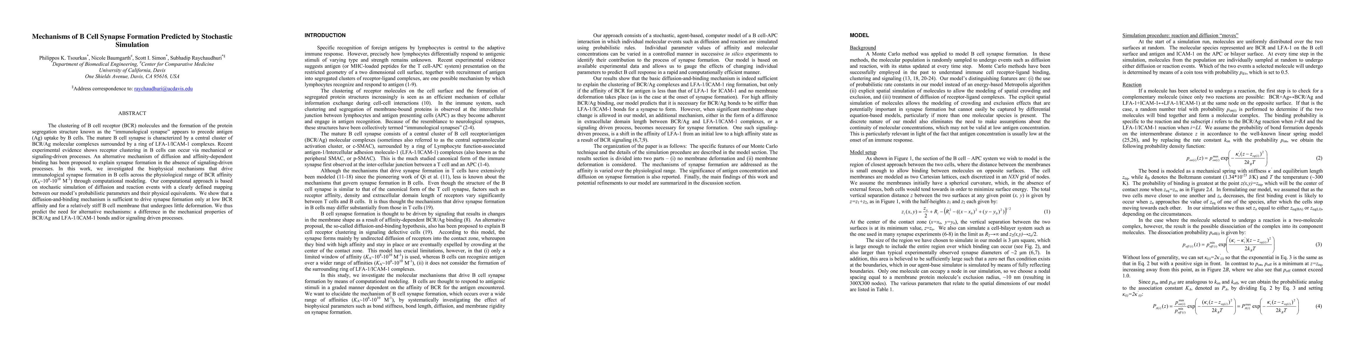 This paper uses stochastic simulation to explore the mechanisms of B cell synapse formation, finding that diffusion and affinity-dependent binding alone can only drive synapse formation at low BCR affinity and under specific membrane conditions. It predicts the necessity of alternative mechanisms, such as differences in bond mechanics or signaling processes, for synapse formation across a physiological range of BCR affinities.