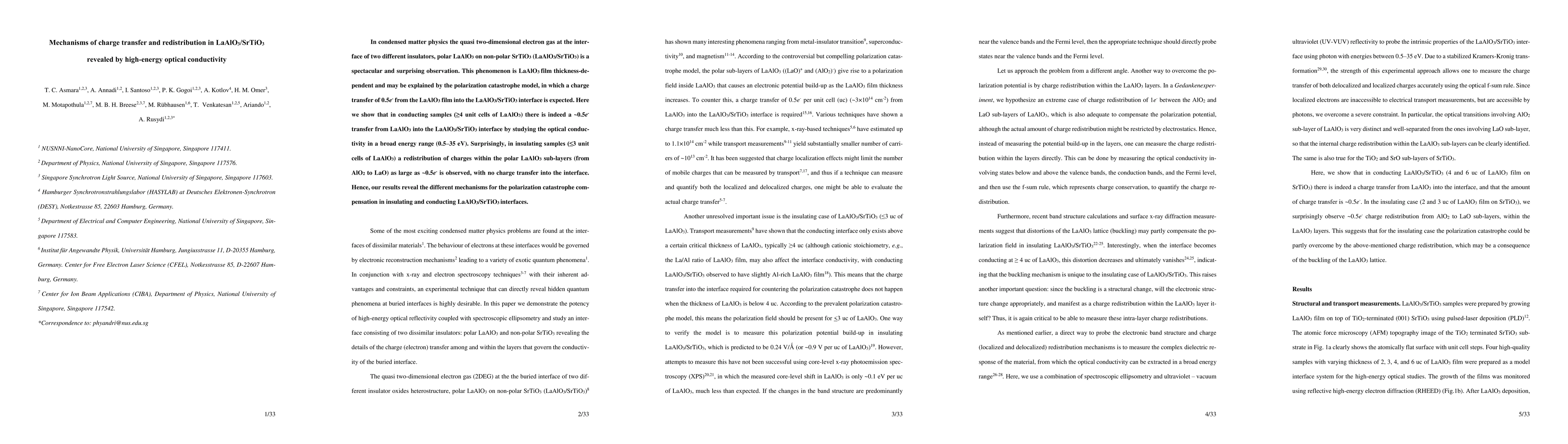 This study investigates charge transfer and redistribution at LaAlO3/SrTiO3 interfaces using high-energy optical conductivity, finding a 0.5 electron transfer in conducting samples while insulating samples exhibit a 0.5 electron charge redistribution within LaAlO3 layers.