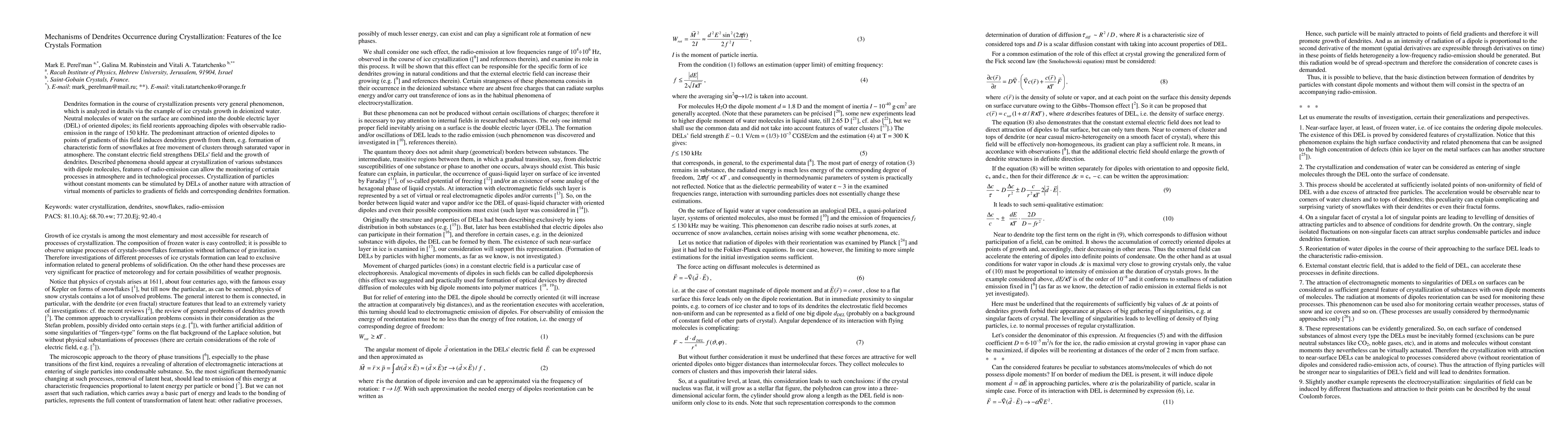 Dendrites formation in the course of crystallization presents very general phenomenon, which is analyzed in details via the example of ice crystals growth in deionized water. Neutral molecules of water on the surface are combined into the double electric layer (DEL) of oriented dipoles; its field reorients approaching dipoles with observable radio-emission in the range of 150 kHz. The predominant attraction of oriented dipoles to points of gradients of this field induces dendrites growth from them, e.g. formation of characteristic form of snowflakes at free movement of clusters through saturated vapor in atmosphere. The constant electric field strengthens DELs' field and the growth of dendrites. Described phenomena should appear at crystallization of various substances with dipole molecules, features of radio-emission can allow the monitoring of certain processes in atmosphere and in technological processes. Crystallization of particles without constant moments can be stimulated by DELs of another nature with attraction of virtual moments of particles to gradients of fields and corresponding dendrites formation.