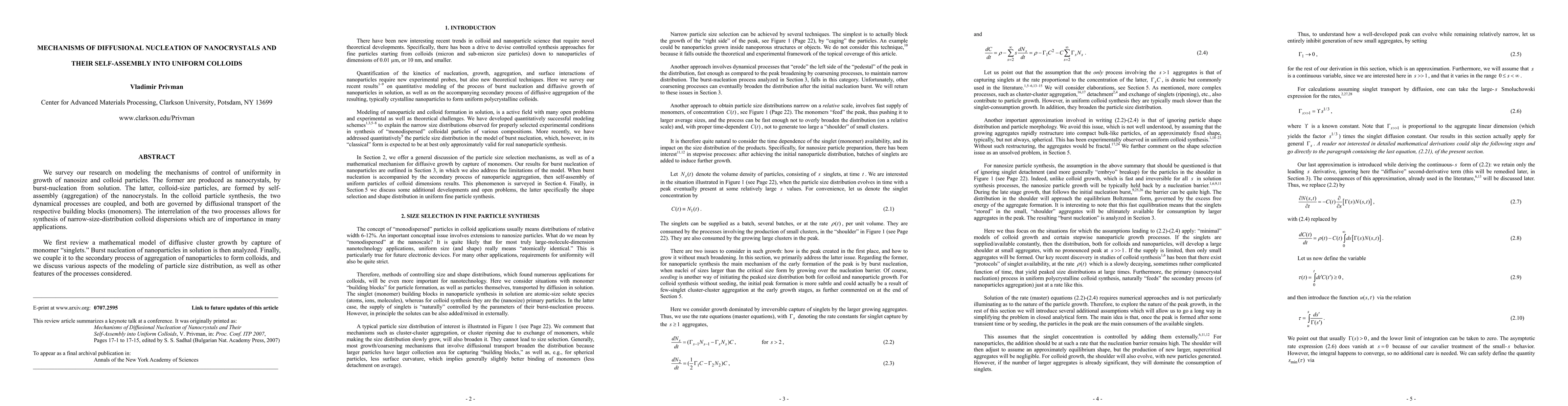 This paper models the mechanisms of diffusional nucleation and self-assembly of nanocrystals into uniform colloids, focusing on the coupled dynamical processes governed by monomer diffusion. It discusses the mathematical model for diffusive cluster growth and analyzes burst nucleation and aggregation to form colloids with narrow size distributions.