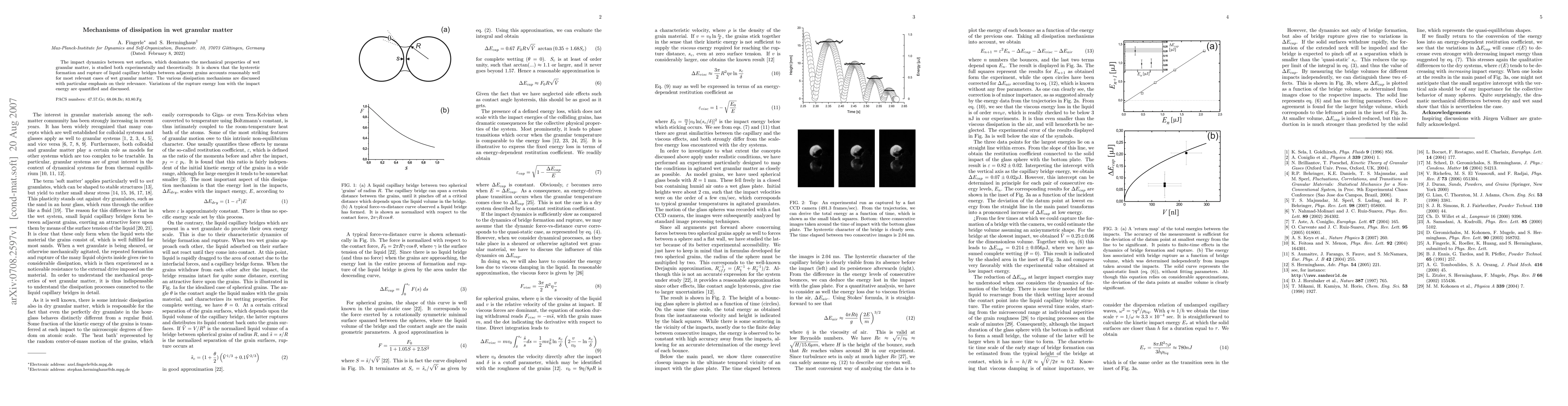 This study investigates the mechanisms of dissipation in wet granular matter through experimental and theoretical analysis, focusing on the hysteretic formation and rupture of liquid capillary bridges. It highlights the significance of these bridges in determining the mechanical properties and identifies the energy loss variations during grain impacts.