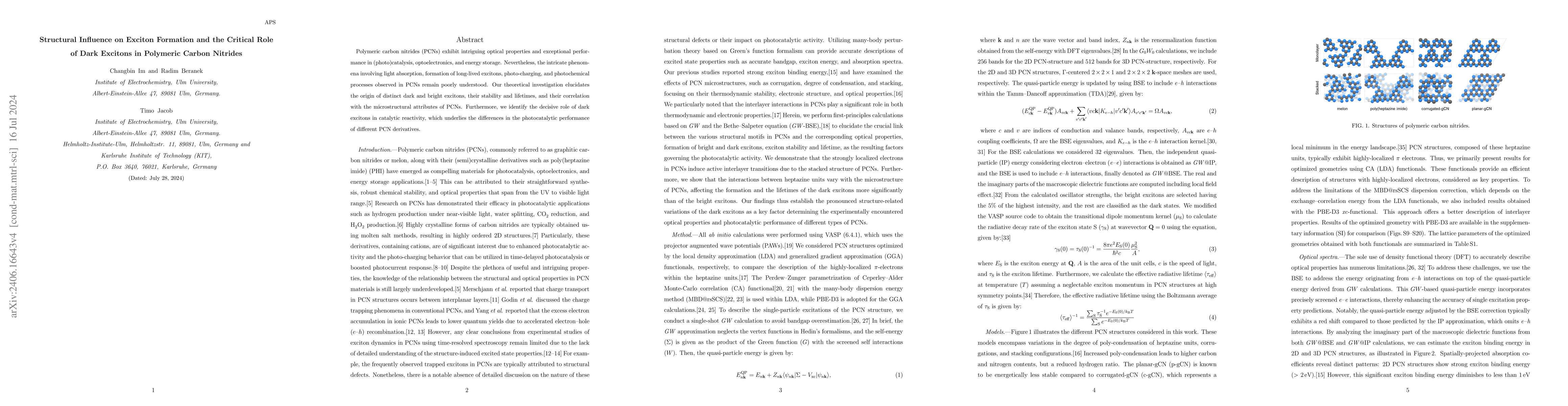 This research investigates the mechanisms behind exciton formation and long-lived states in polymeric carbon nitrides (PCNs), revealing the roles of distinct exciton species and the influence of microstructural features on exciton stability and catalytic reactivity. The study correlates theoretical findings with experimental observations to better understand the optical and catalytic properties of PCNs.
