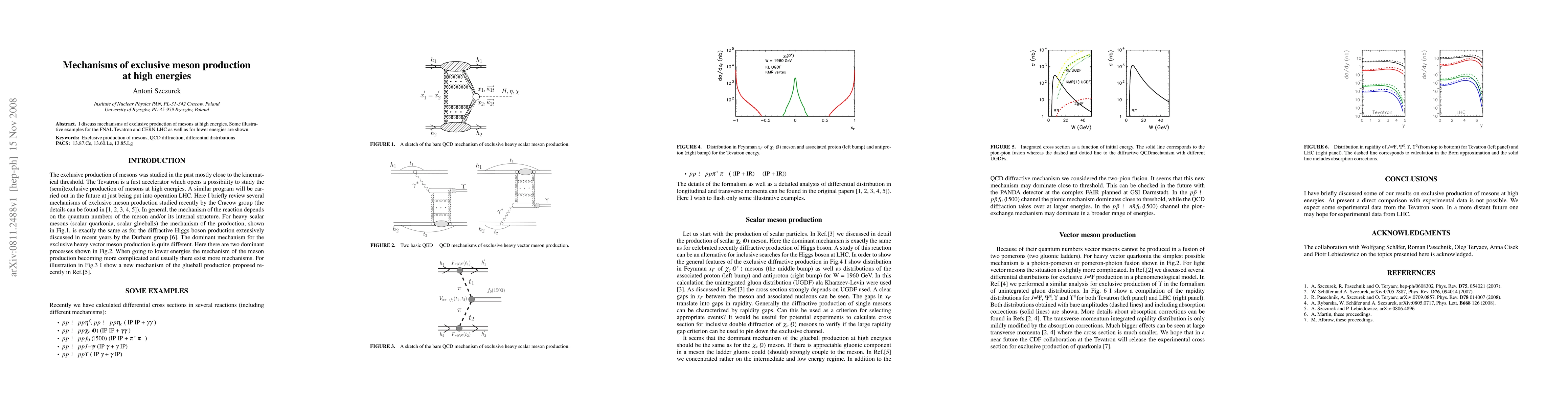 I discuss mechanisms of exclusive production of mesons at high energies. Some illustrative examples for the FNAL Tevatron and CERN LHC as well as for lower energies are shown.