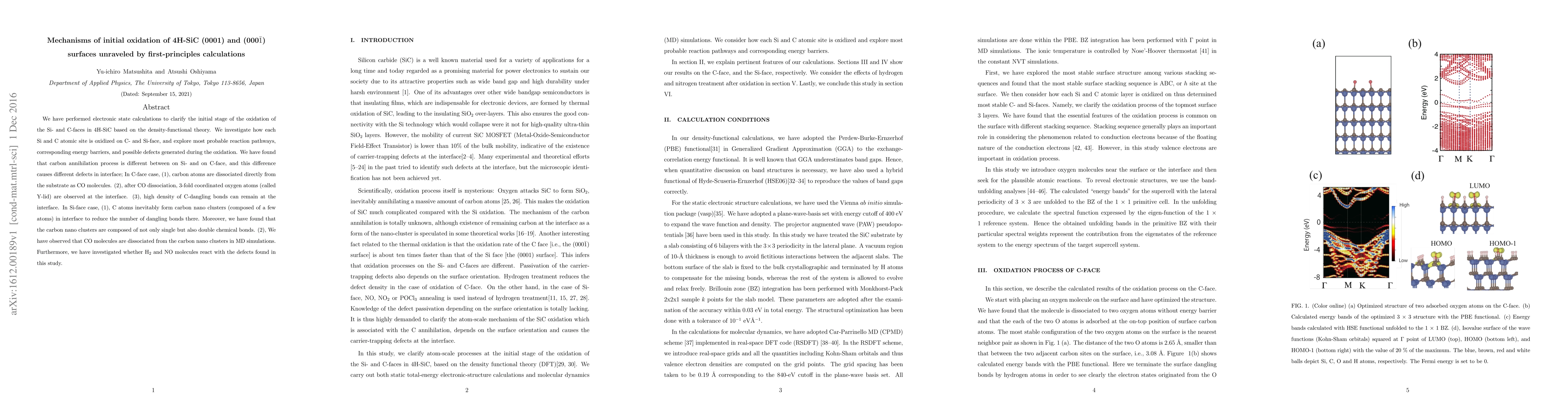 We have performed electronic state calculations to clarify the initial stage of the oxidation of the Si- and C-faces in 4H-SiC based on the density-functional theory. We investigate how each Si and C atomic site is oxidized on C- and Si-face, and explore most probable reaction pathways, corresponding energy barriers, and possible defects generated during the oxidation. We have found that carbon annihilation process is different between on Si- and on C-face, and this difference causes different defects in interface; In C-face case, (1), carbon atoms are dissociated directly from the substrate as CO molecules. (2), after CO dissociation, 3-fold coordinated oxygen atoms (called Y-lid) are observed at the interface. (3), high density of C-dangling bonds can remain at the interface. In Si-face case, (1), C atoms inevitably form carbon nano clusters (composed of a few atoms) in interface to reduce the number of dangling bonds there. Moreover, we have found that the carbon nano clusters are composed of not only single but also double chemical bonds. (2), We have observed that CO molecules are dissociated from the carbon nano clusters in MD simulations. Furthermore, we have investigated whether H$_2$ and NO molecules react with the defects found in this study.